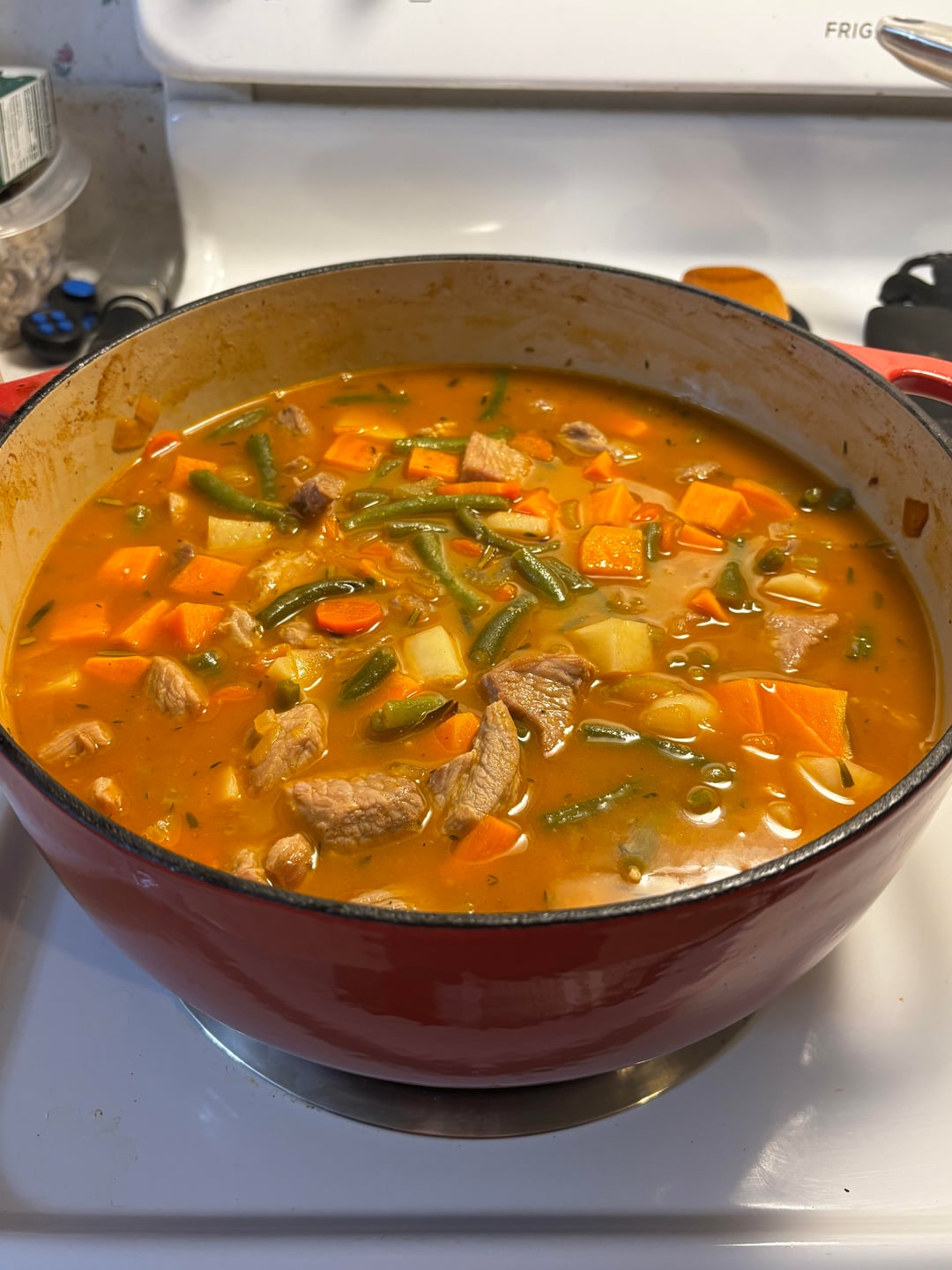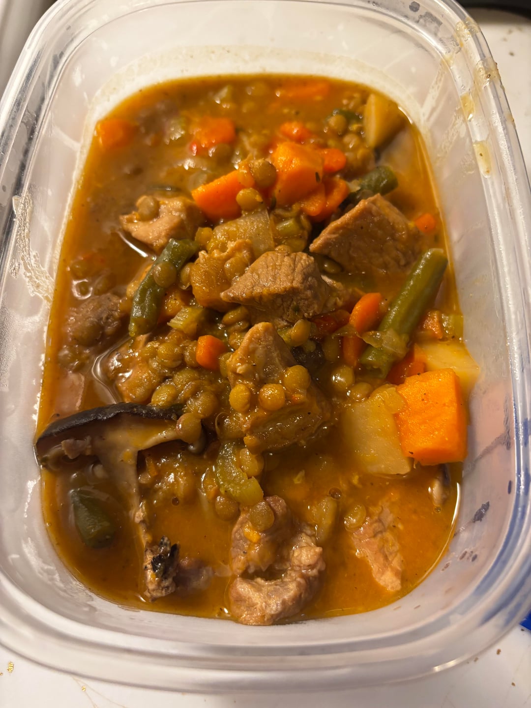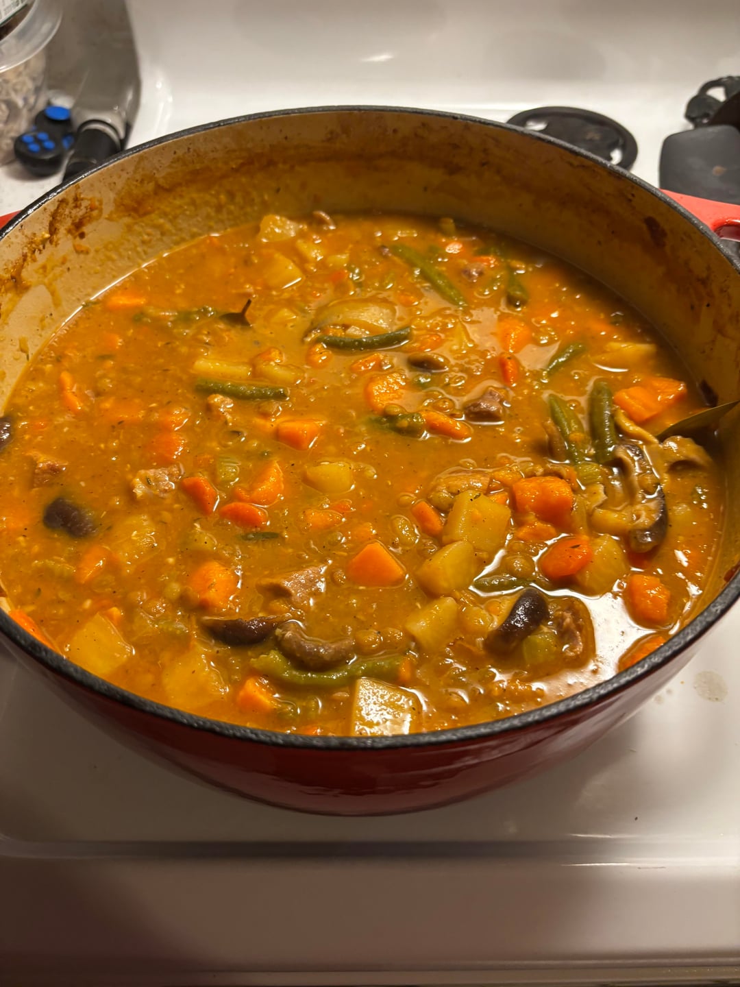 Ingredients: Pork (cubed and set aside for searing- pork should roasts tend to work best but any boneless pork should be fine) 1 1/2 yellow onion, diced fine 4-5 carrots, peeled and diced 4-5 stalks of celery, diced 6 mini sweet bell peppers, seeded and diced 2 large sweet potatoes, peeled and diced into small cubes 4-5 russet potatoes, peeled and diced into small cubes (put both of the potatoes in cold, salty water to keep from discoloring) Fresh green beans with ends snapped and in about 1 1/2” pieces (nearly my entire bag went bad within three days of purchase so this could be amended by using a cheap bag of frozen green beans) 1 cup of lentils (any type, cooked in salted water with half of a rough chopped onion- follow cooking instructions, then set aside) 1 pkg of shiitake mushrooms(I splurged on the mushrooms because my grocery stores NEVER carry them). Any mushroom would be fine. Garlic (I use the jarred garlic because I don’t like my hands smelling like garlic for days- I’m sure fresh is best 1 can of tomato paste Fresh thyme and rosemary Flour to thicken the aromatics and give stew some thickening White wine for deglazing pot (I used a box of Chardonnay) 1 carton of low sodium chicken broth Salt and pepper to taste Oil of your choice- I had olive oil.