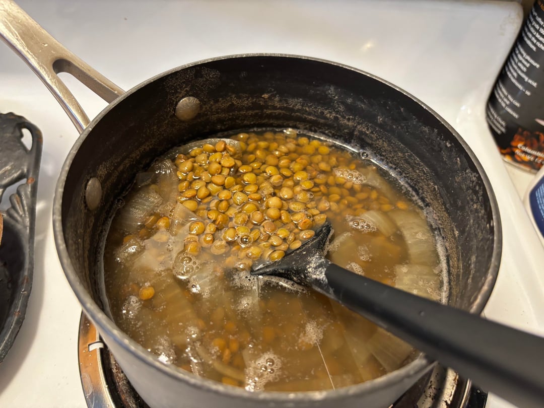 1 cup of lentils (any type, cooked in salted water with half of a rough chopped onion- follow cooking instructions, then set aside)