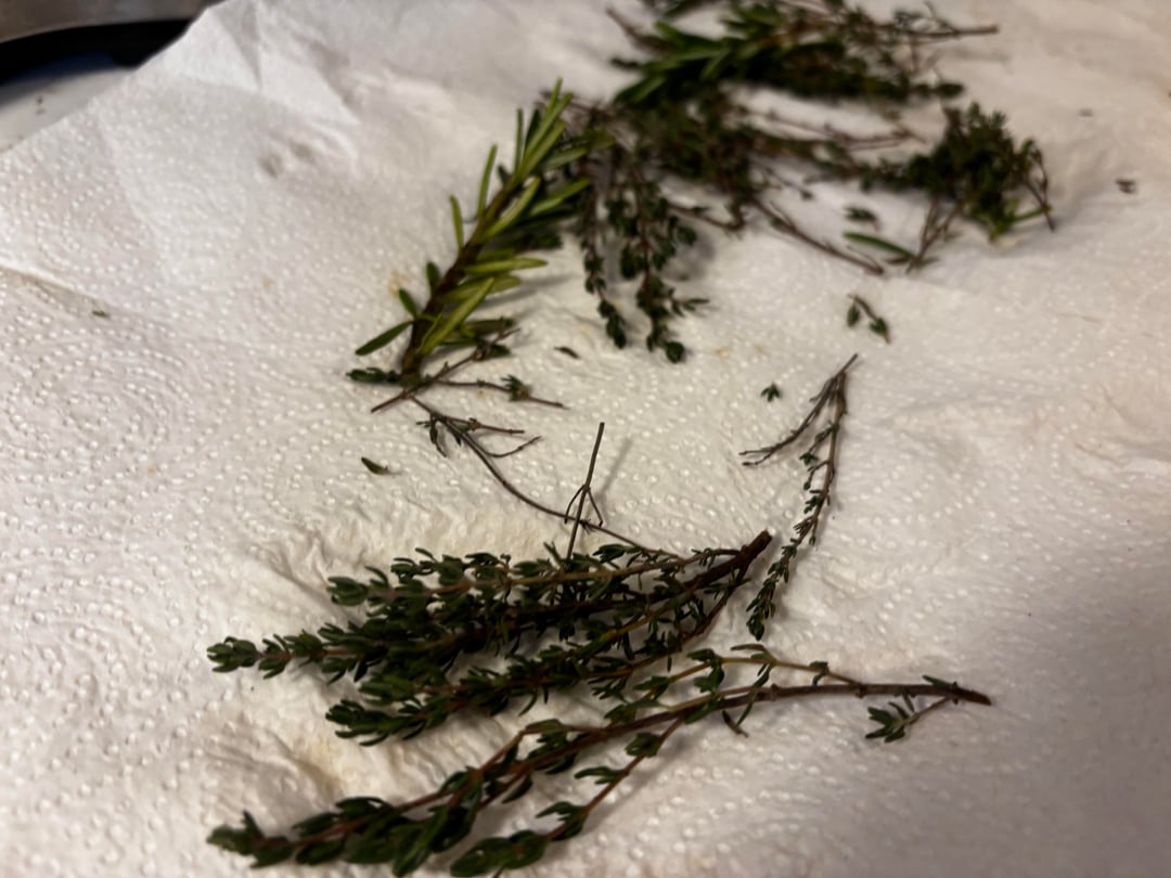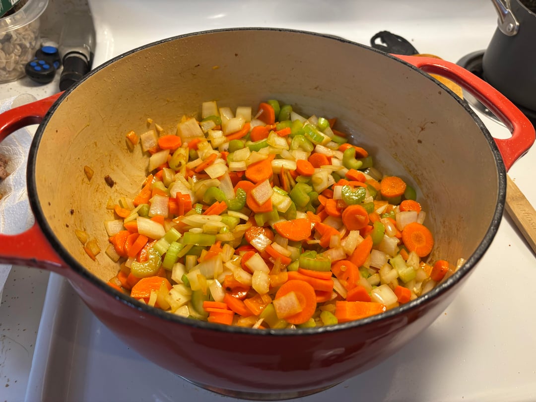 I added 1 Tbsp butter plus one Tbsp more oil to pot, then once melted threw in my aromatics (onion, carrots, celery, peppers) into the pot to cook down. It takes a LONG TIME. This “five mins to translucent” is a joke. This usually takes me at least 30 mins (but I need my onions to be completely cooked). Add in the fresh herbs, salt and pepper to taste. Stir about five more minutes then add in your garlic- do this after the other vegetables have been cooked down because garlic can burn. After about three mins I added 3 Tbsp of the tomato paste and mixed it in with the rest of the vegetables.