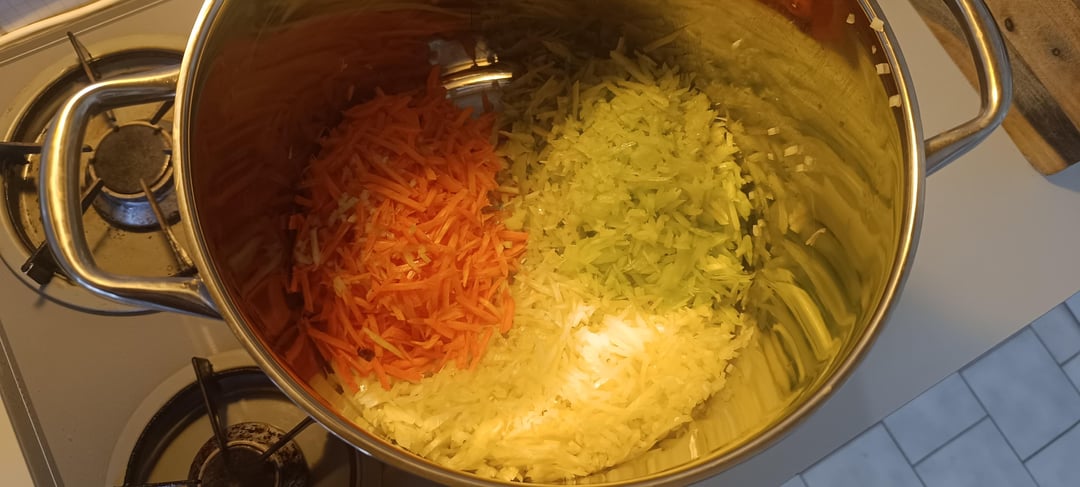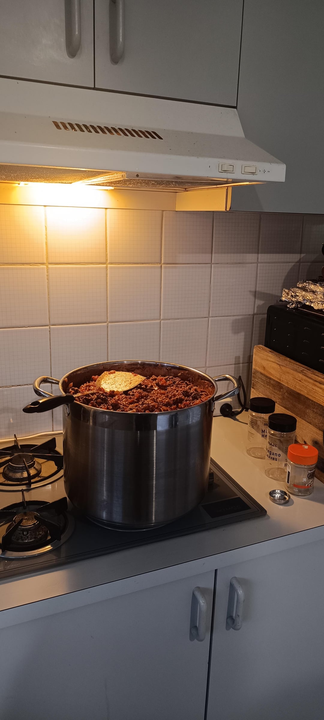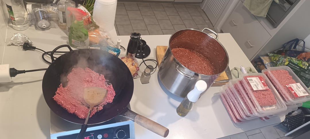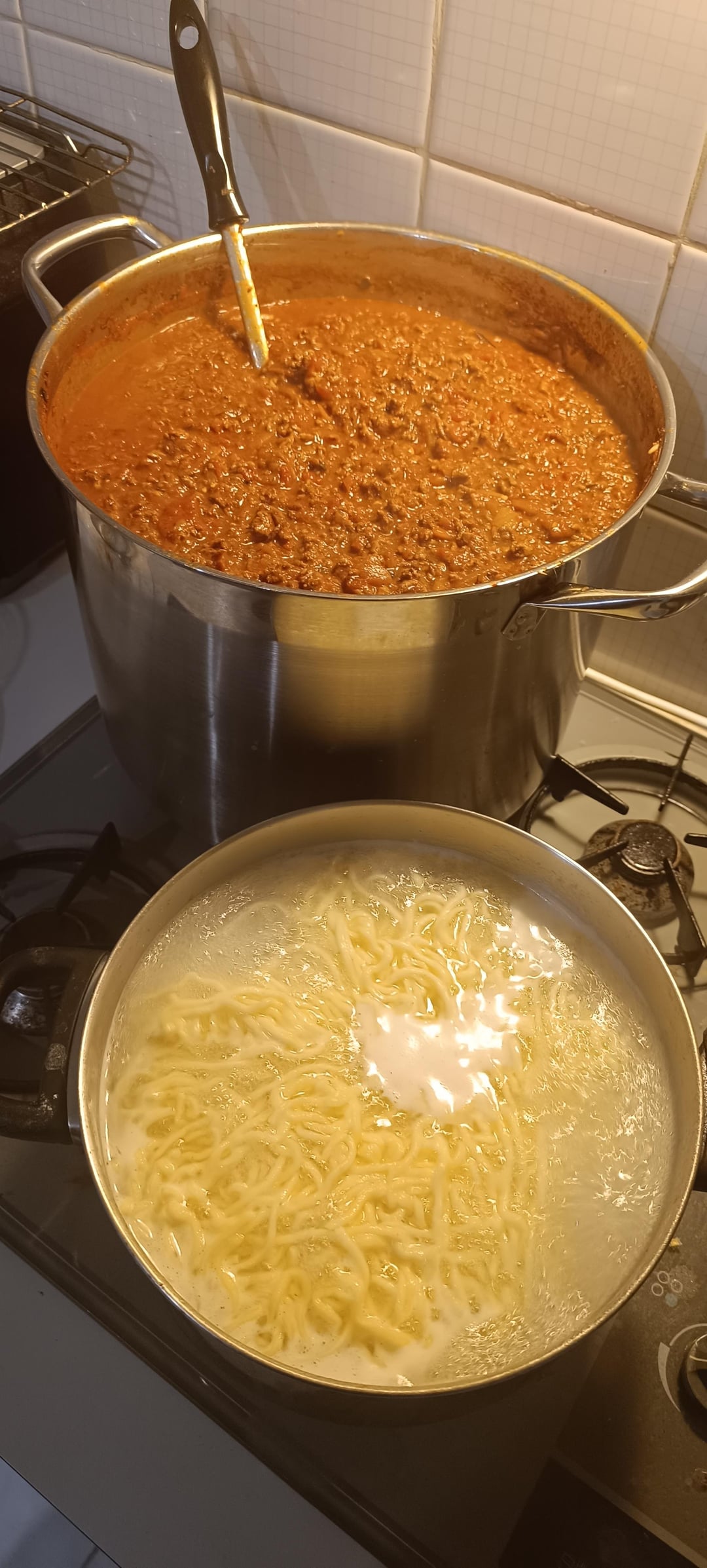 16 liters at a time. Hard sear beef in the wok, machine aided cutting off the onion carrot celery, quick trip to the store door another ten cans of crushed tomatoes (my count was way off). Not pictured was 3 heads of garlic, an arseload of rosemary, thyme & vegemite.