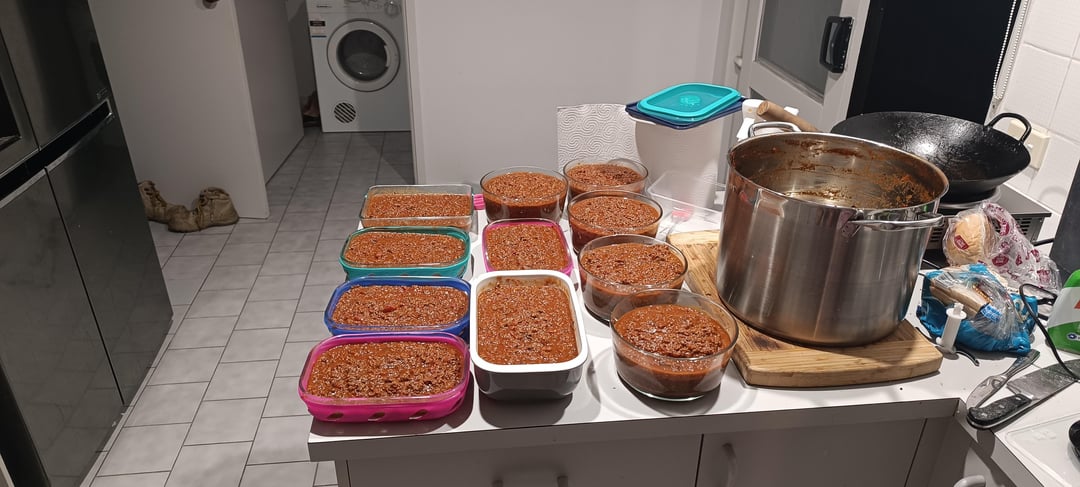 Chilled overnight in separate bowls, then packed into double serve sandwich bags for the freezer. This 16L pot made 52 serves at a total cost of $2.30 per dish.