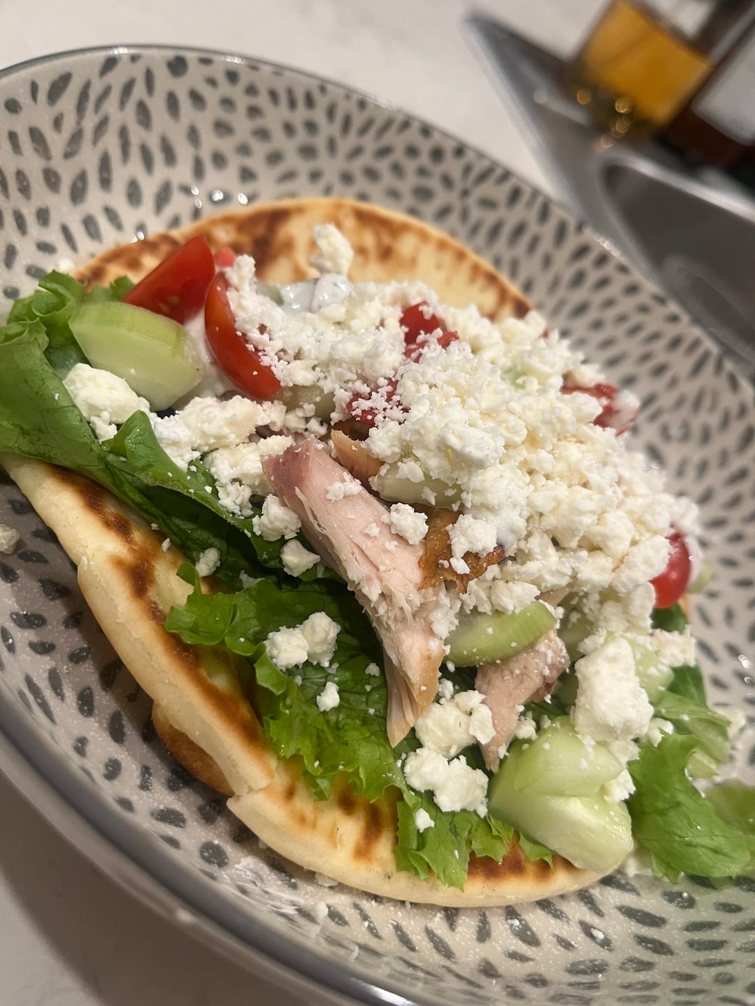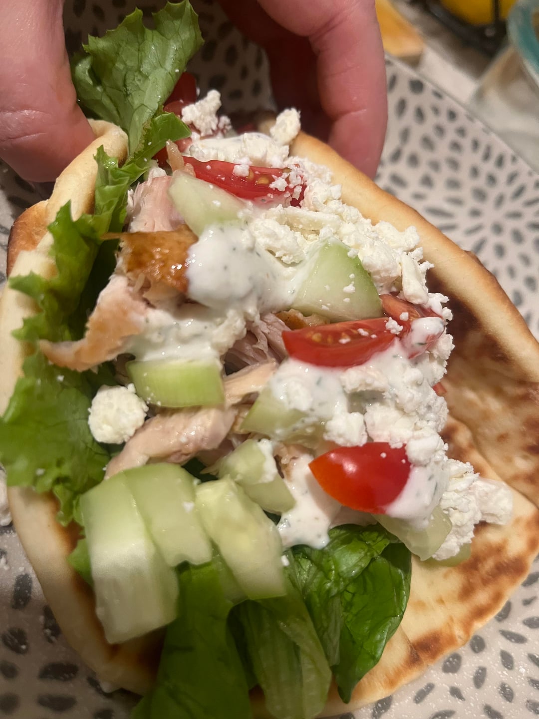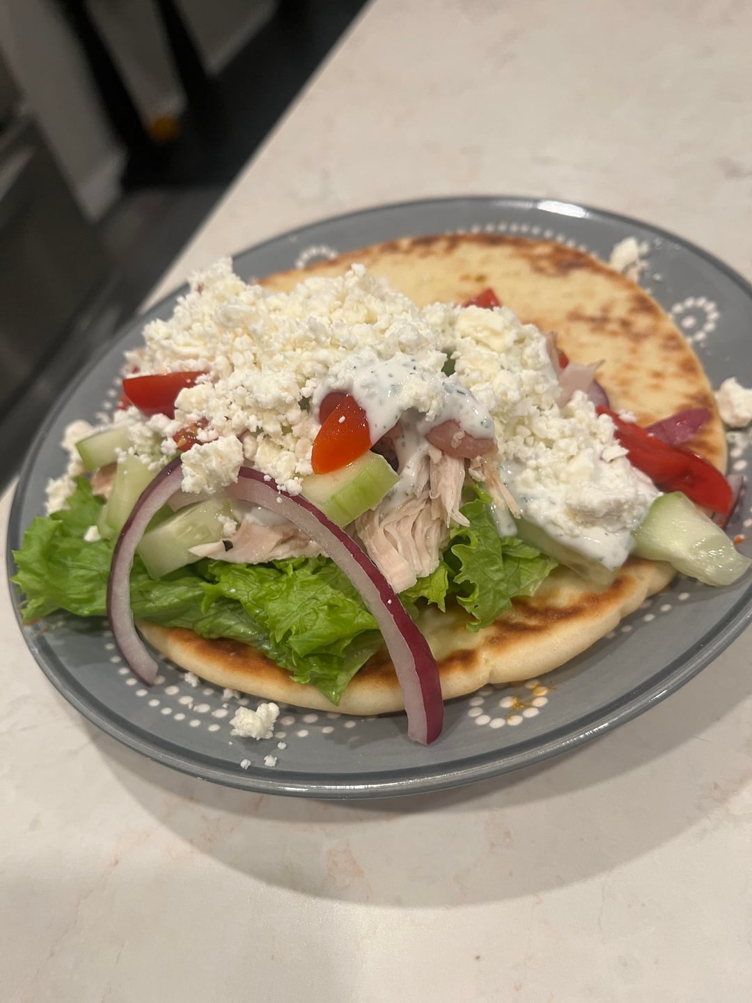 Flatbread, Chicken (I usually season chicken breast with salt, pepper, paprika, and turmeric powder but went with rotisserie chicken tonight), Lettuce, Cucumber, Grape tomatoes, Red onion, Feta cheese, White sauce: Greek yogurt, hint of mayo, water to your liking of consistency, garlic powder, onion powder, salt, parsley flakes