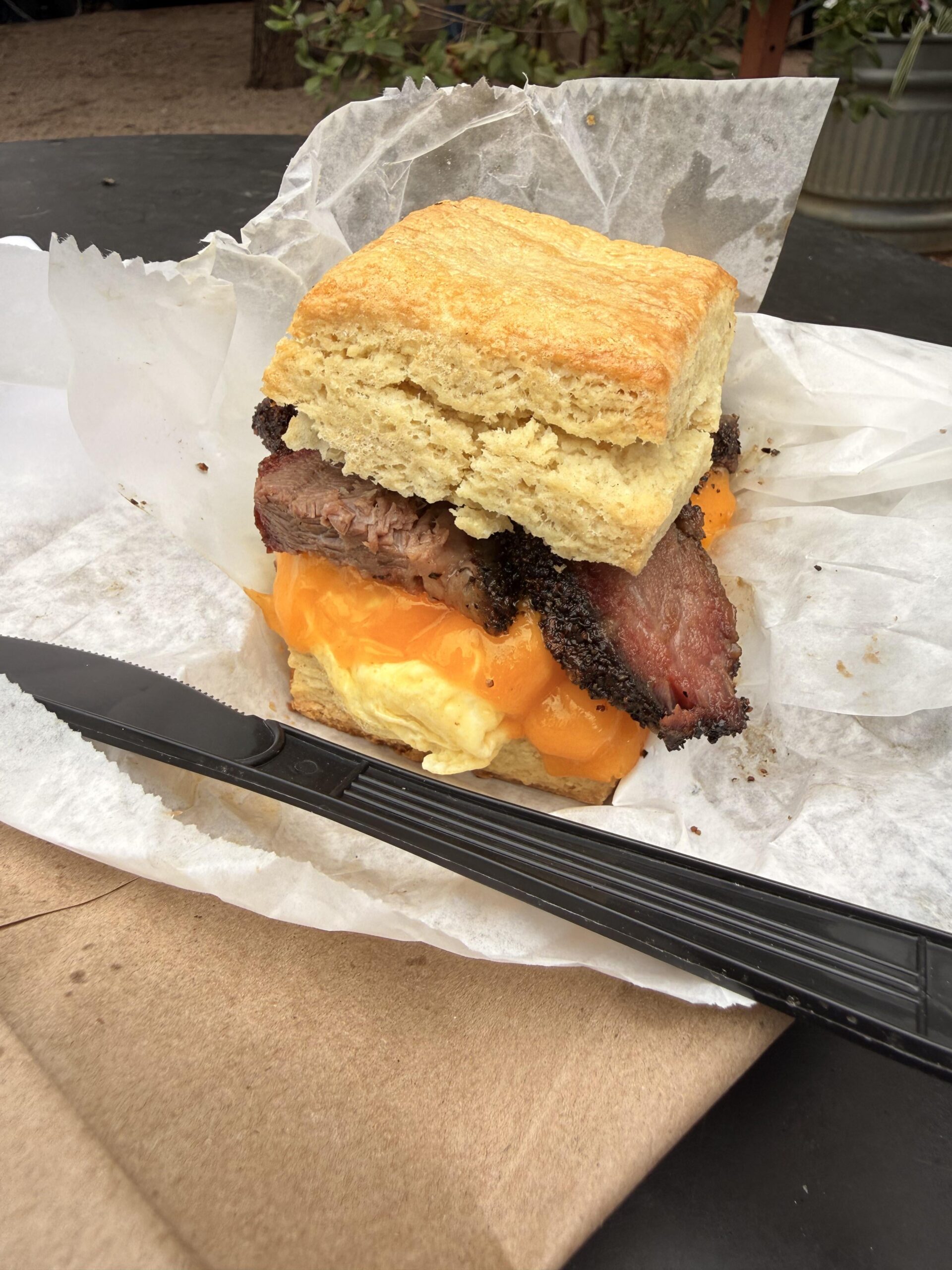 I finally tried Briscuits! I had the egg, cheese, and brisket biscuit, it was really good. The portion size is generous, and tall enough that I had to eat it with a fork and knife. The meat is prepared in a huge smoker on site that lives in a separate trailer. I would consider this a special outing breakfast, it was $17 and it was worth it.