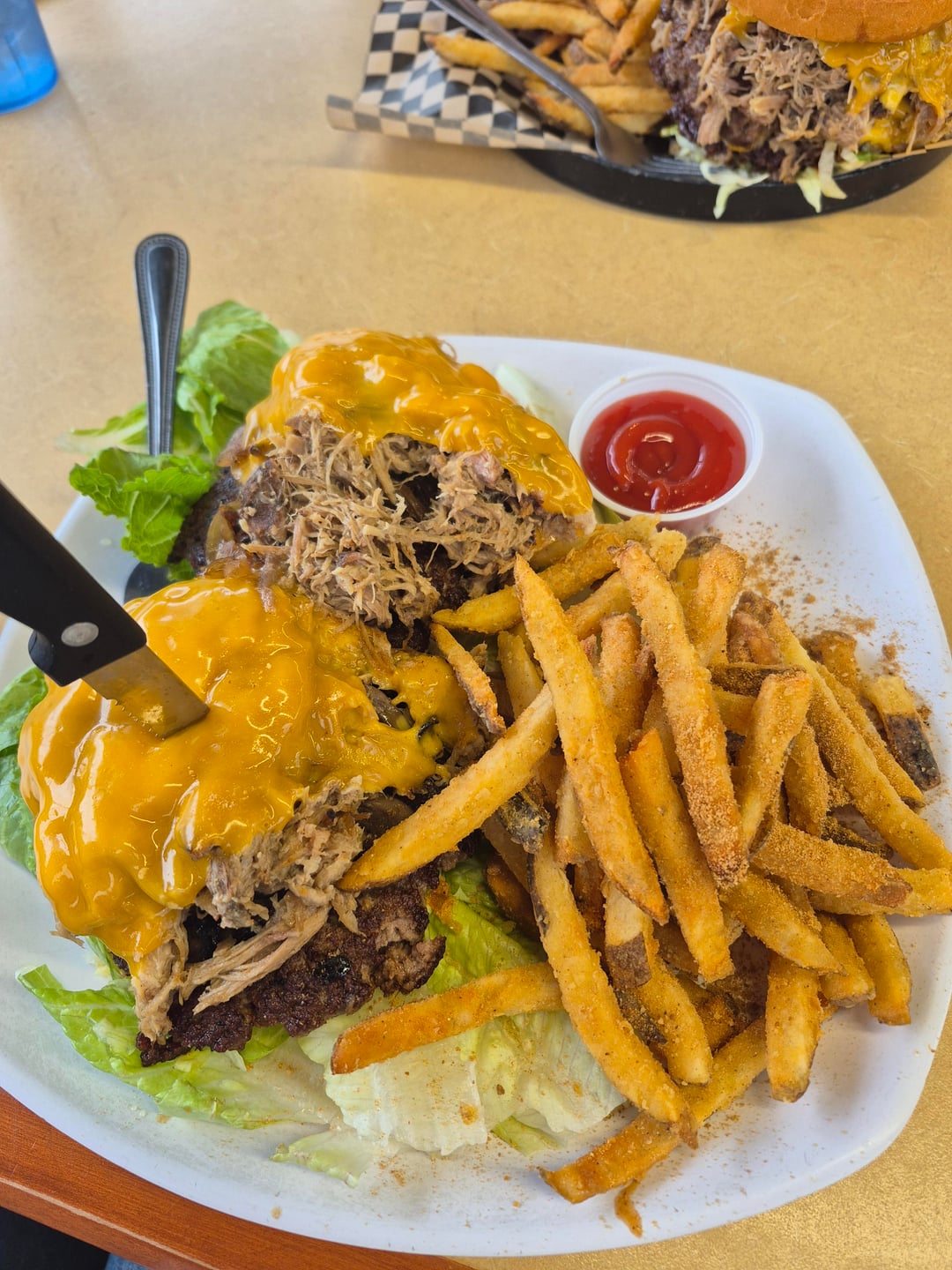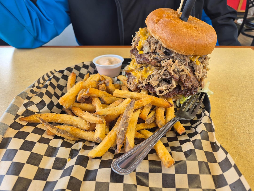 Double beef, bacon, pulled pork, cheddar, sautéed mushrooms, caramelized onions, and whiskey bbq. With pickle, lettuce, tomato, and mayo underneath.