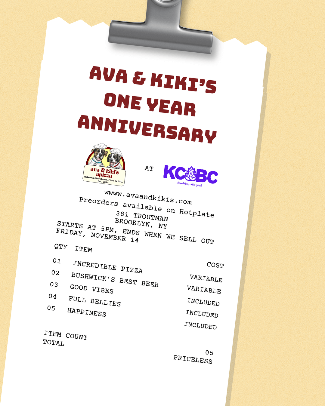 Hey r/FoodNYC! As promised, the flyer and preorder links are now live for our event at KCBC tomorrow. We cannot WAIT to get back to one of our favorite popup locations and serve some New Haven-style pizza! This will be the last time to join us until next month, and the last time this current menu will be available.