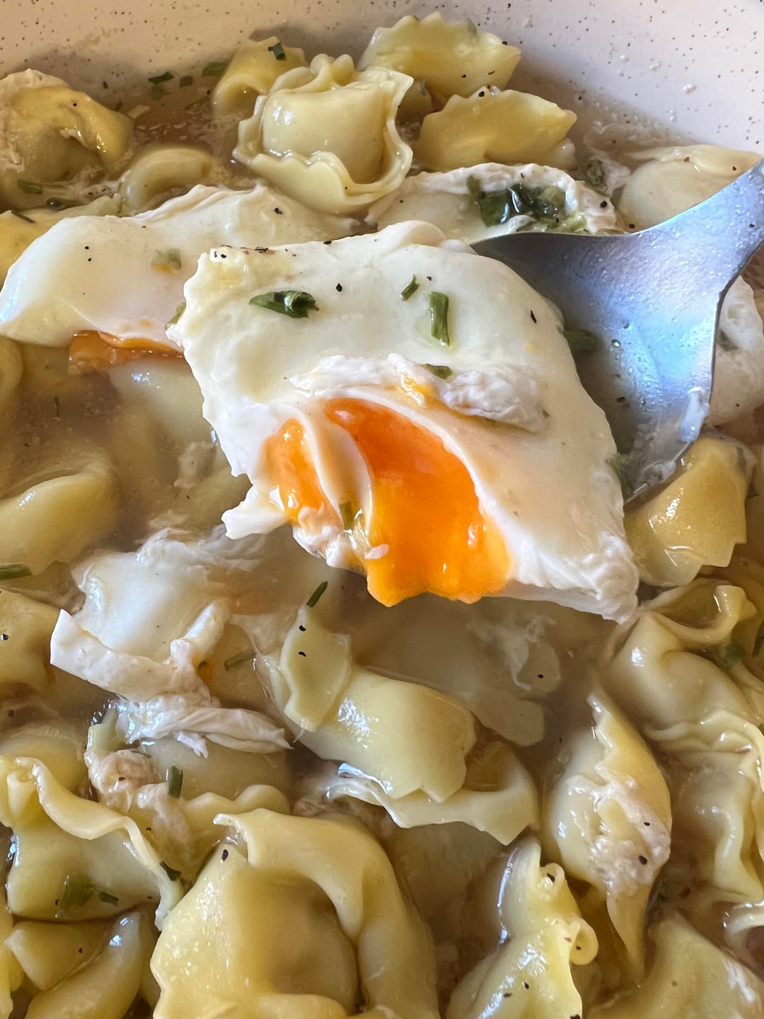 Turn your heat down medium and drop the stock in. When it boils, drop the tortellini, and after 1 minute drop in your eggs (just take them out of the shells and let them fall in). Cook for another minute without stirring. Serve with black pepper and dried chives or literally anything you want and dig in.