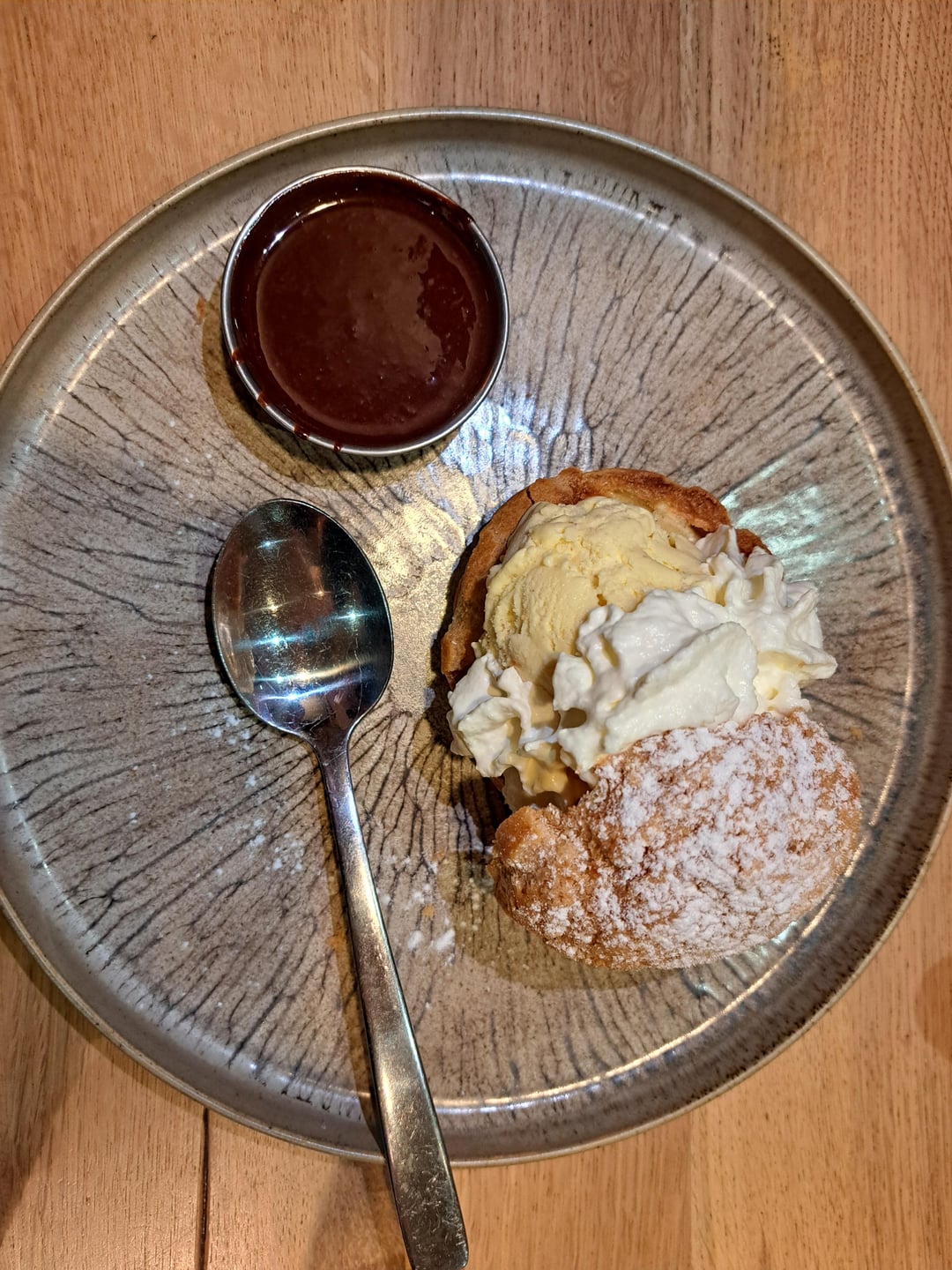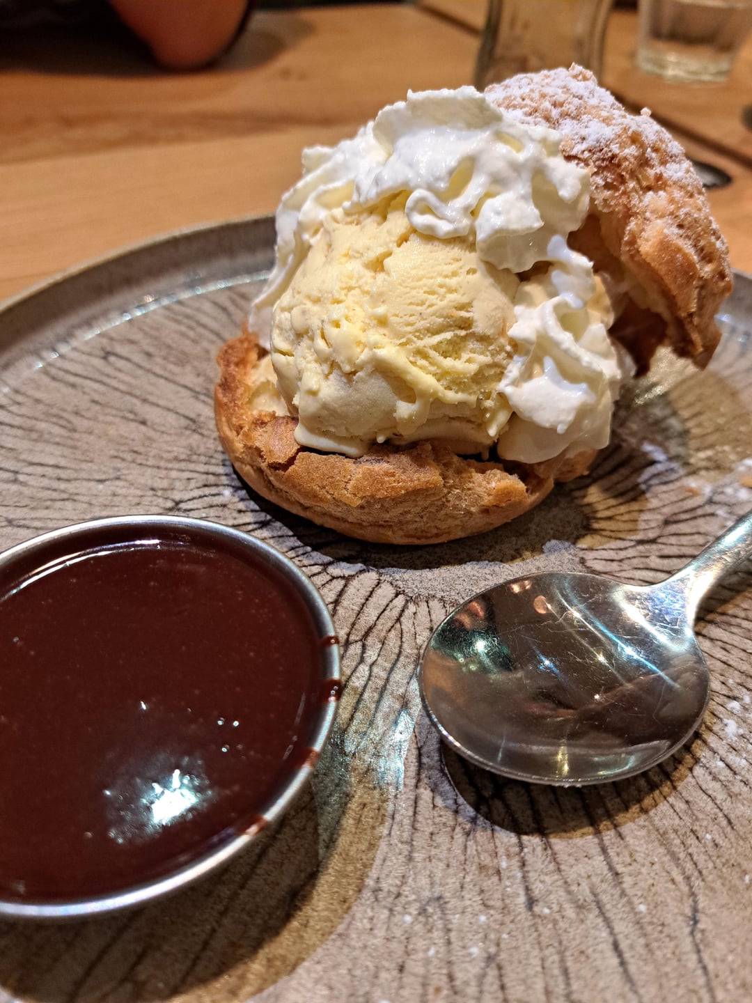 it's a profiterole with vanilla ice cream, whipped cream and hot chocolate sauce