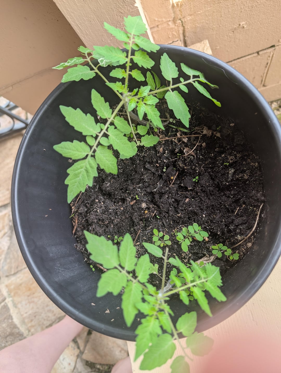 BTW, you will have much better results if you only grow one tomato plant per container. I would re-pot one (or both) of the two in your last photo. It’s difficult to judge the size of a container in a photo, but I wonder if the one shown is too small. 5-gallons should be the absolute minimum, even for a cherry tomato such as yours.