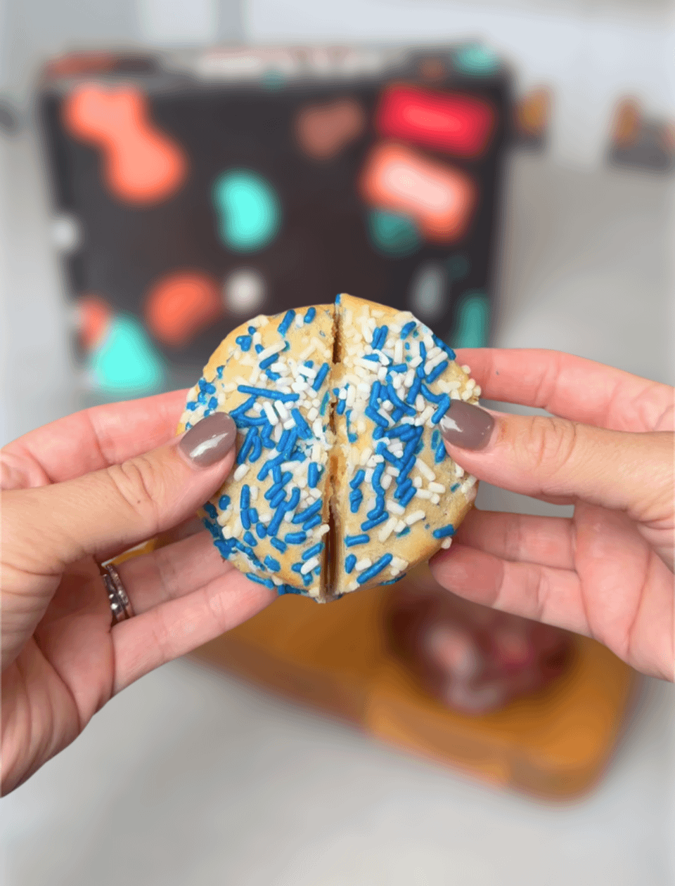 Delicious classic sugar cookie dough base stuffed with sugar cookie chunks, a frosting core, and its all topped with blue and white sprinkles.by fatandweirdcookieco Dining and Cooking