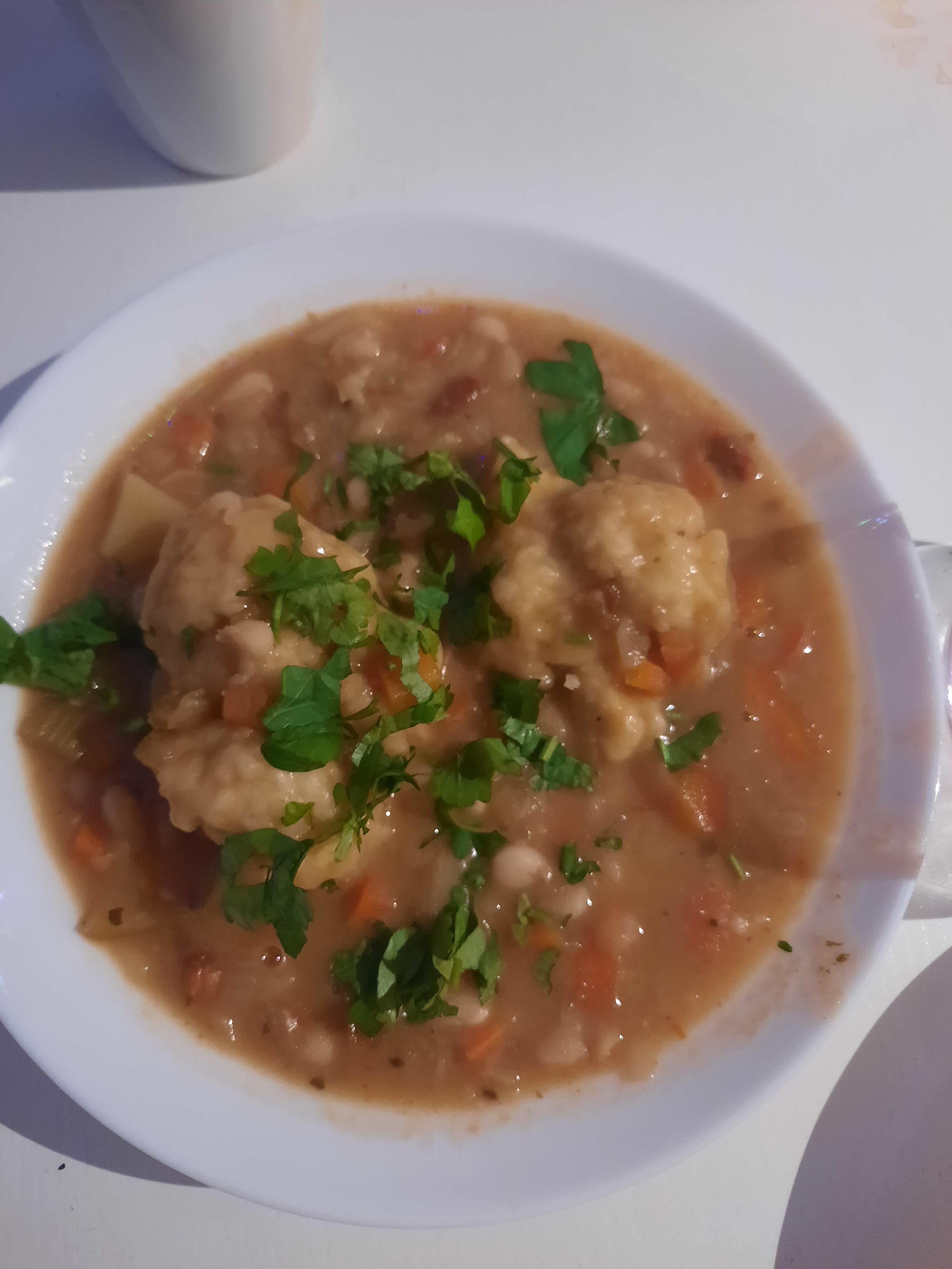 For the soup i diced and sauteed onion, carrots, celery, potato and few spoonfuls of chopped sundried tomators in oil. I seased with a bit of cumin seeds, salt and black pepper. In the meantime i used the scraps of the veg to flavor the broth I was making from 2 veggie bouillon cubes. I then added the strained broth to the sauteed veg ans added white beans that I had soaked and cooked in a pressure cooker. The dumplings thickened the soup up nicely then I topped with a bit of parsley.