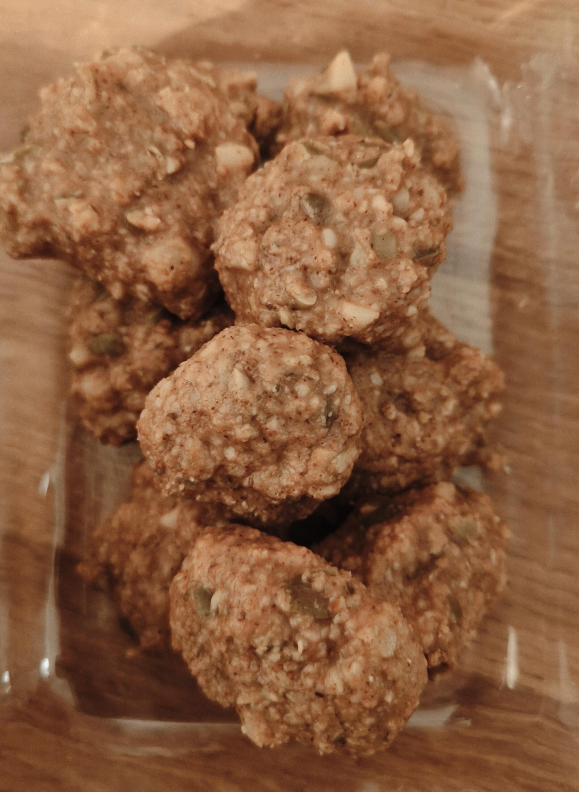 Put the macadamias and pumpkin seeds in a bowl and whizz with a hand blender. You can roughly chop a bit first. I like it when some of it is more finely whizzed and then you have some chunkier bits too. Give the mix a stir. Heat the fat in a pan and pour in the mix. Toast for about 5 mins on a gentle heat until the nuts are slightly browning. Then stir in the almond butter and salt heat for a further minute. Then add the ground almonds to thicken the mixture and take off the heat. Allow to cool slightly and then roll into balls and put in the fridge to firm up!