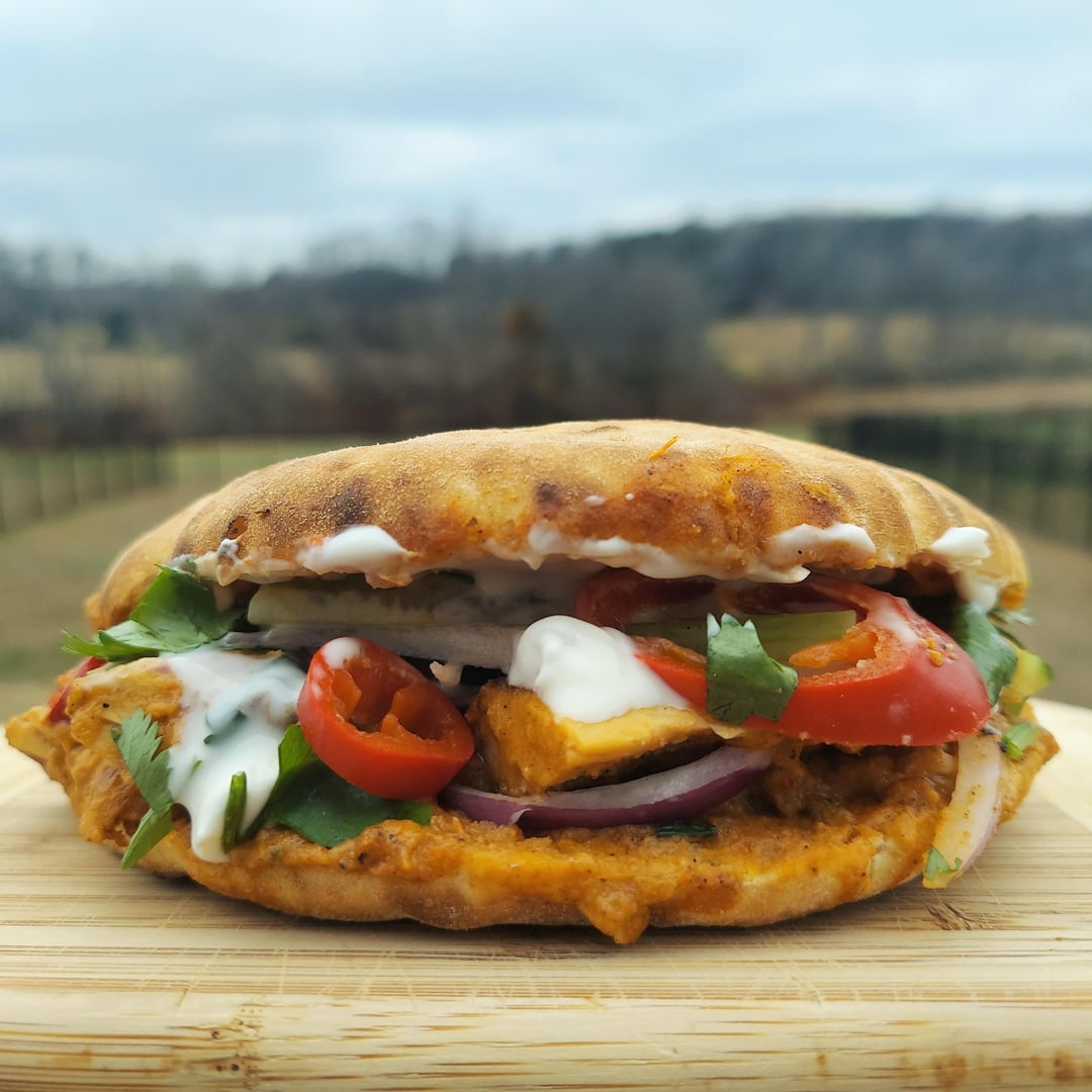 4) Just chicken tikka masala in a toasted pita with baby cucumbers, shaved red onions, pickled Fresno chilis, cilantro and Kite Hill sour cream.