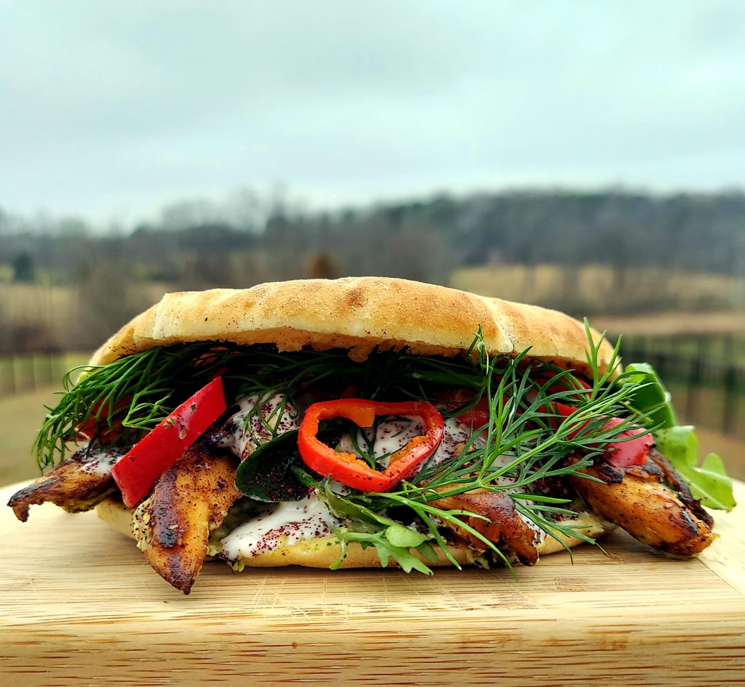 1) Toasted pita with Just chicken and caramelized onions seasoned with oregano, cumin, garlic, smoked paprika, and sumac; layered with Toom, jalapeรฑo-cilantro hummus, arugula, Kite Hill sour cream, pickled Fresno chilis, and fresh dill.