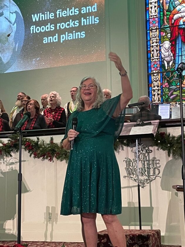 Song Leader Beverly Cox leads the audience in singing carols. PROVIDED