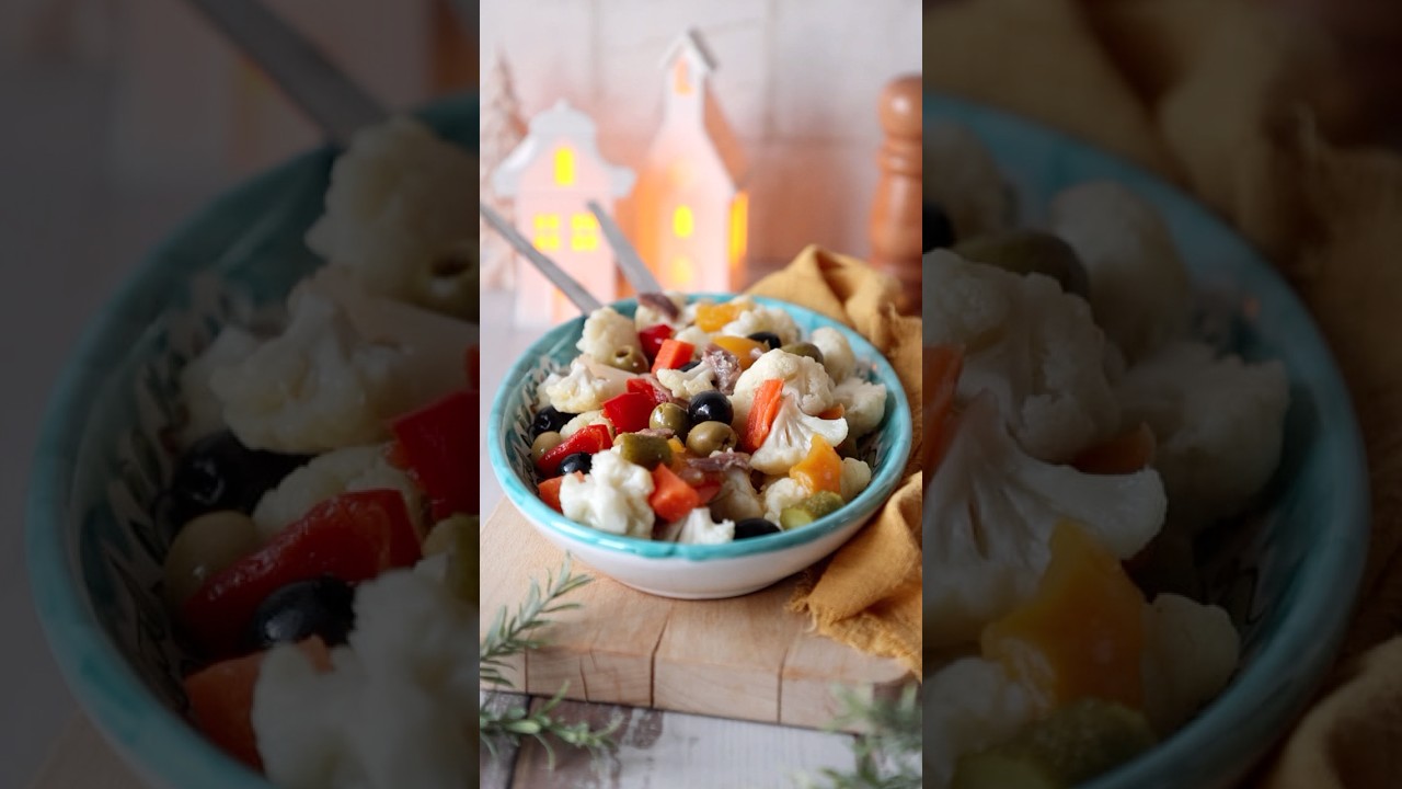 Nata per arricchire l’antica cena di Magro della vigilia, l’insalata di rinforzo e un antipasto o contorno festivo tipico napoletano e campano. L’ingrediente principale è il cavolfiore che va lavato, mondato e diviso in cimette. Non buttate foglie e gambi perché sono utili per altre ricette. Si fa bollire o anche meglio cuocere al vapore in modo che resti croccante e si unisce alla giardiniera di verdure miste tagliate a pezzetti, papaccelle se le trovate, altrimenti peperoni sottoaceto e acciughe. Io taglio tutto a pezzetti, ma la grandezza potete deciderla in base ai vostri gusti. [Musica] Per finire si aggiungono olive verdi e olive nere snocciolate e se vi piacciono potete anche metterci dei capperi. Condiamo con olio extravergine di oliva, aceto secondo i vostri gusti e sale e mescoliamo. ha assolutamente preparata il giorno prima perché deve riposare per dare il meglio ed è davvero freschissima e ideale per accompagnare anche i piatti più ricchi delle nostre tavolate di festa.