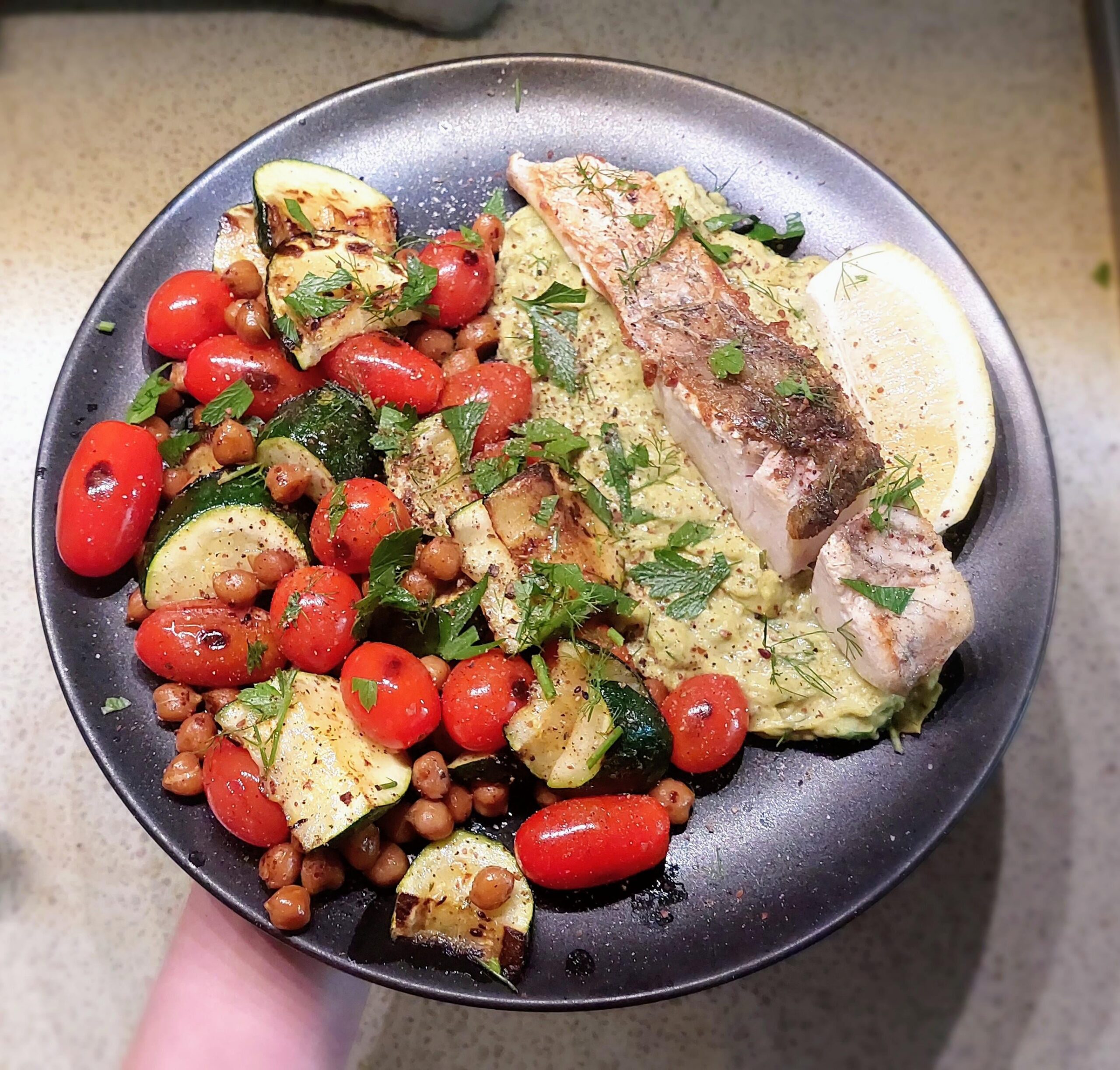 lay fish on top of mixture. put veg on plate. add fresh herbs and seasoning, I used S&P, sumac and lemon