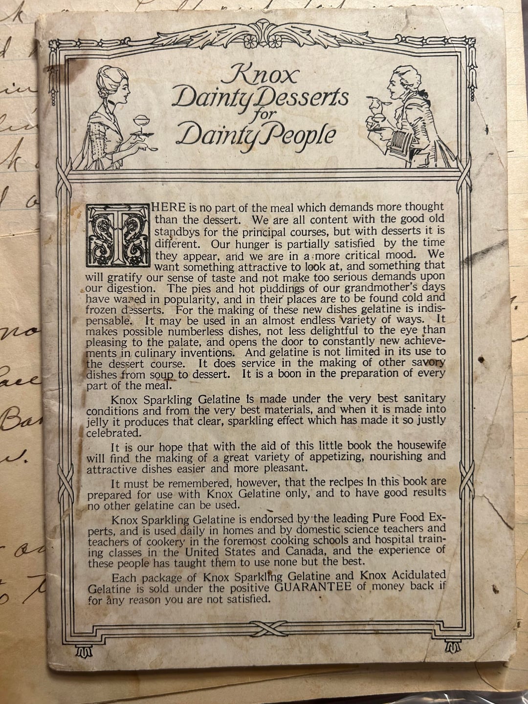 The earliest written date is the note for “Jan. 4th, 1926”, and it also includes some pamphlets and newspaper cut outs from throughout the mid-1900’s. Definitely want to give some of these a try, though I may stay away from the endless number of jello and strange “salad” recipes. Excluding, of course, absolutely needing to try something from “Knox’s Dainty Desserts for Dainty People.”