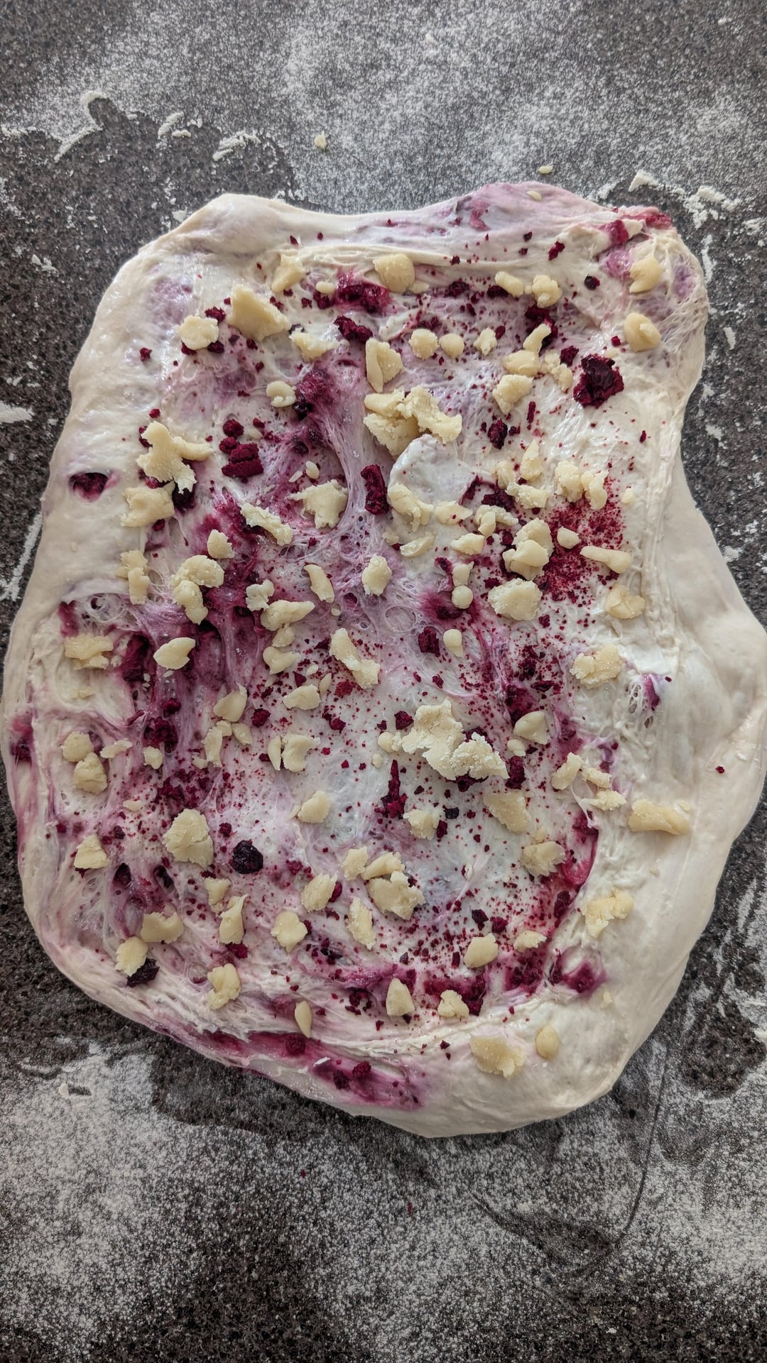 Freeze dried cherries and Almond paste from Trader Joe's. Smashed the cherries to powder w/chunks. Added cherries (tried to just get the powder) during last two stretch & folds, and then added the bigger pieces, and crumbled almond paste during lamination.