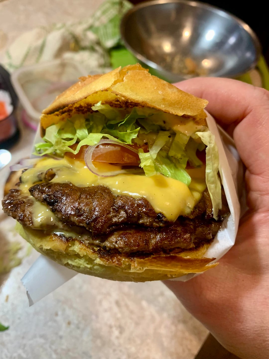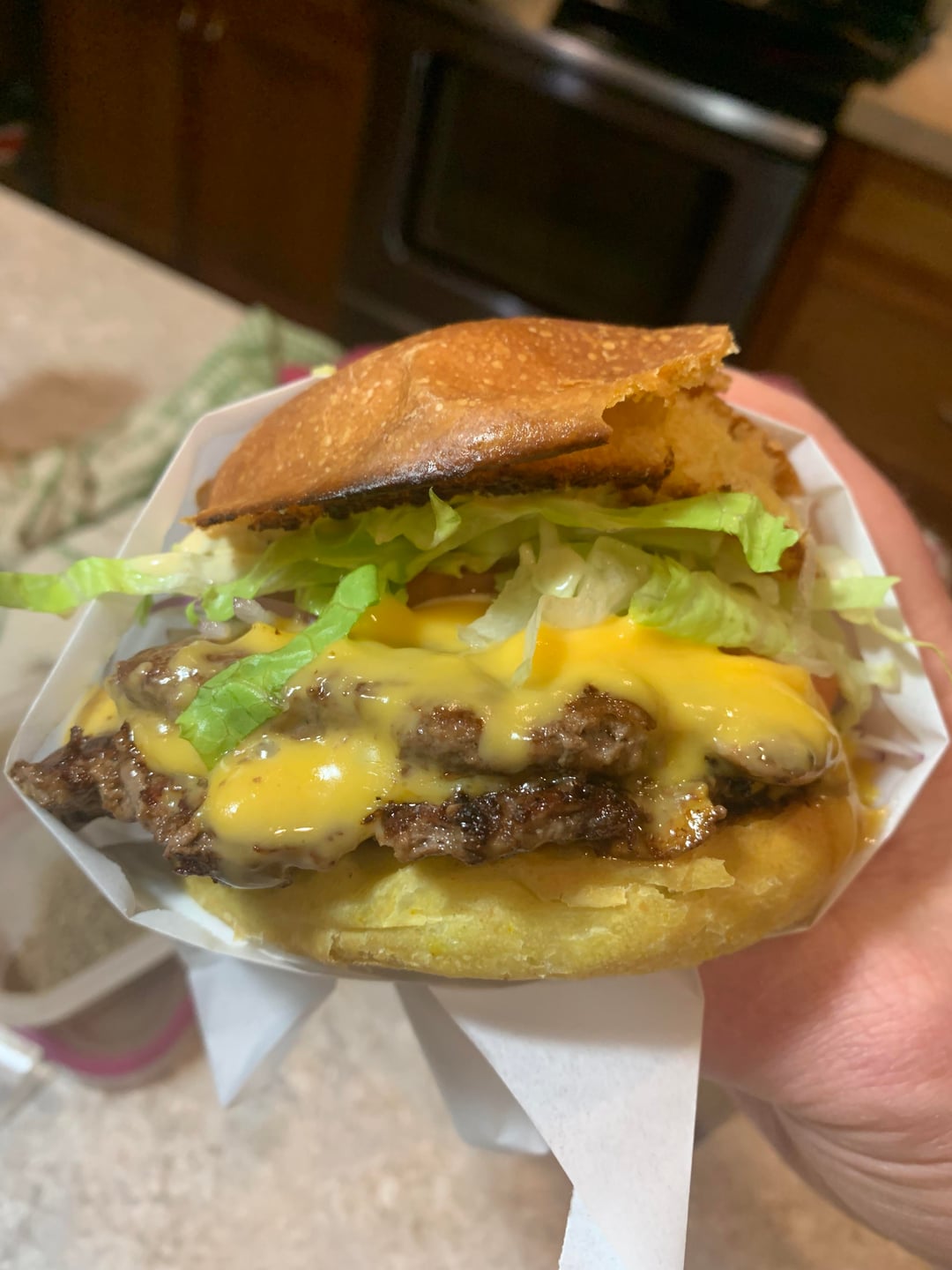 Looks terrible. Like the burger decided to die halfway to your dinner. Tonight I had an amazing burger. Thick, on a Brioche buns with sautéed onions, thinly sliced long Pickles, with ketchup, I added 2 big pieces of corn flake chicken fingers with thousand island dressing. Tastes so good. How no one has come up with this burger I will never know. I took the idea from a place that does this with a club bread but they spread out the burger pattie and add pastrami.