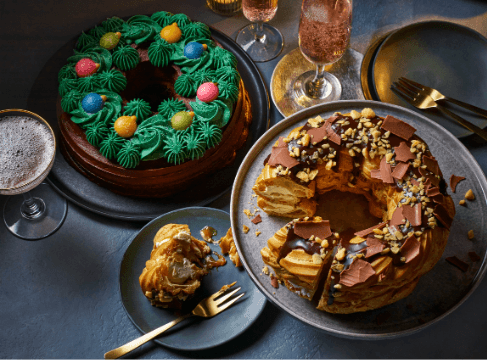 Tesco Finest Belgian Chocolate & Honeycomb Choux Wreath: Layers of choux pastry with sea-salted honeycomb sauce and whipped cream, hand-decorated with chocolate ganache and shards.