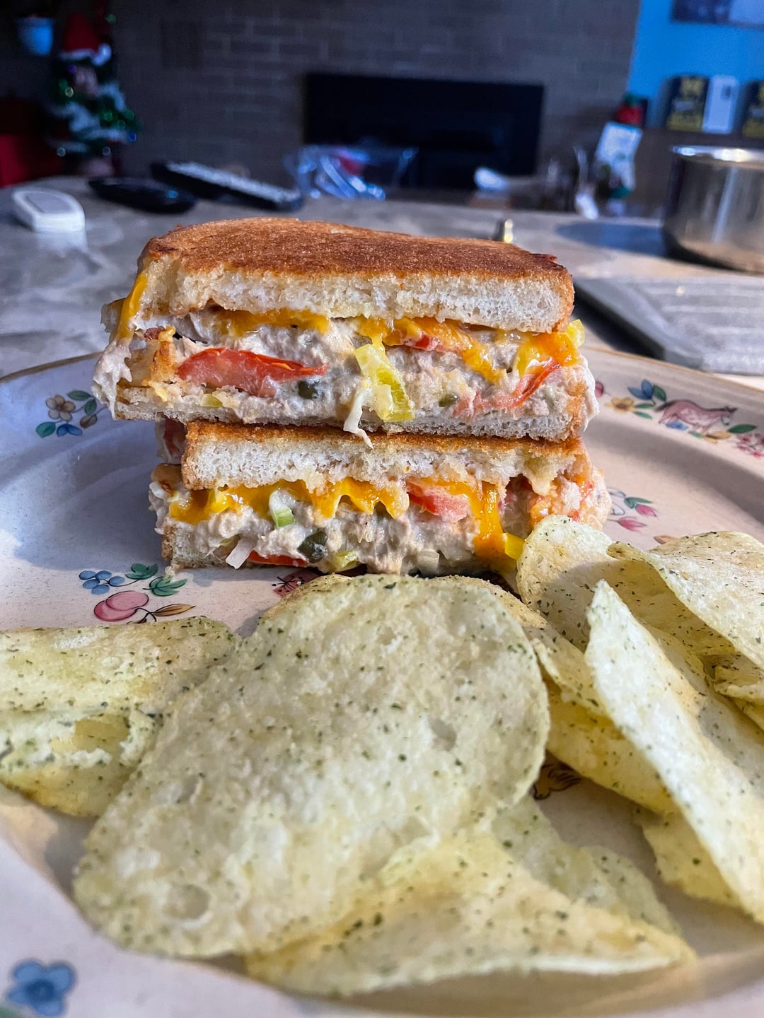 Tuna salad, tomato, hot chili peppers, and cheddar.