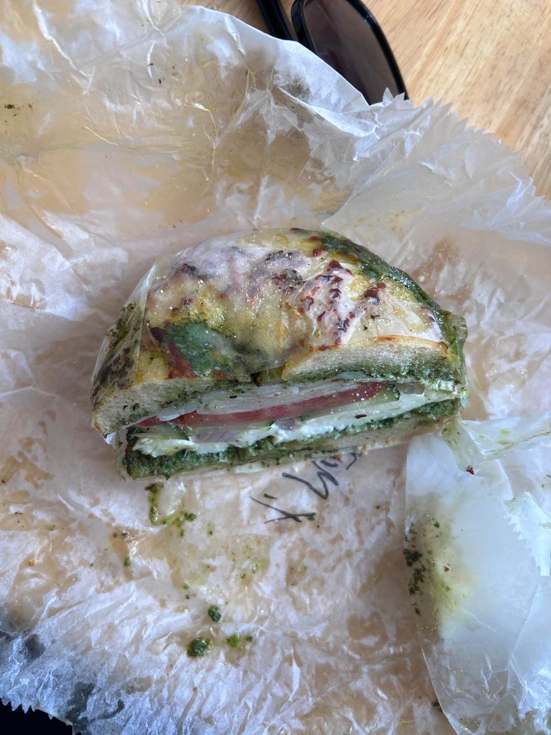 Asiago cheese bagel (full already ate first half hehe). Pesto, mozzarella, turkey, tomato, red onion, cucumber