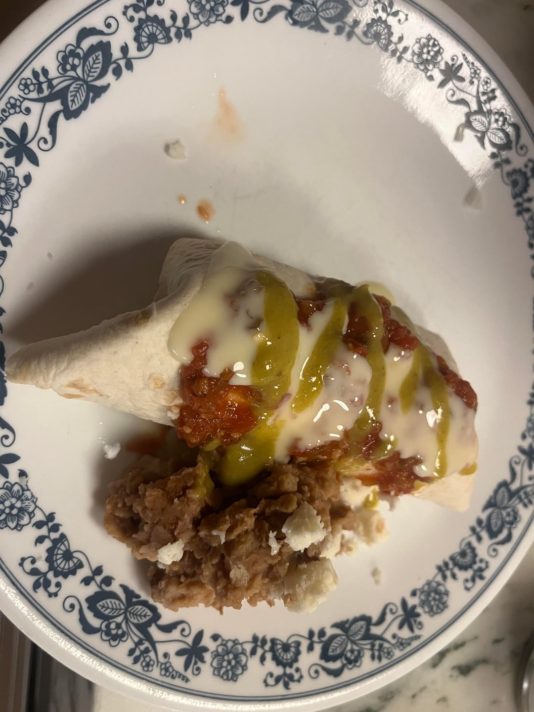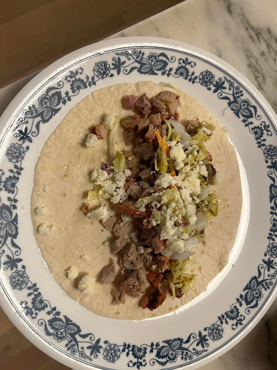 Smoked tenderloin with chili rub a jalapeño lime dressing on shredded cabbage claw for crunch and crumble coteja cheese and a little refried beans