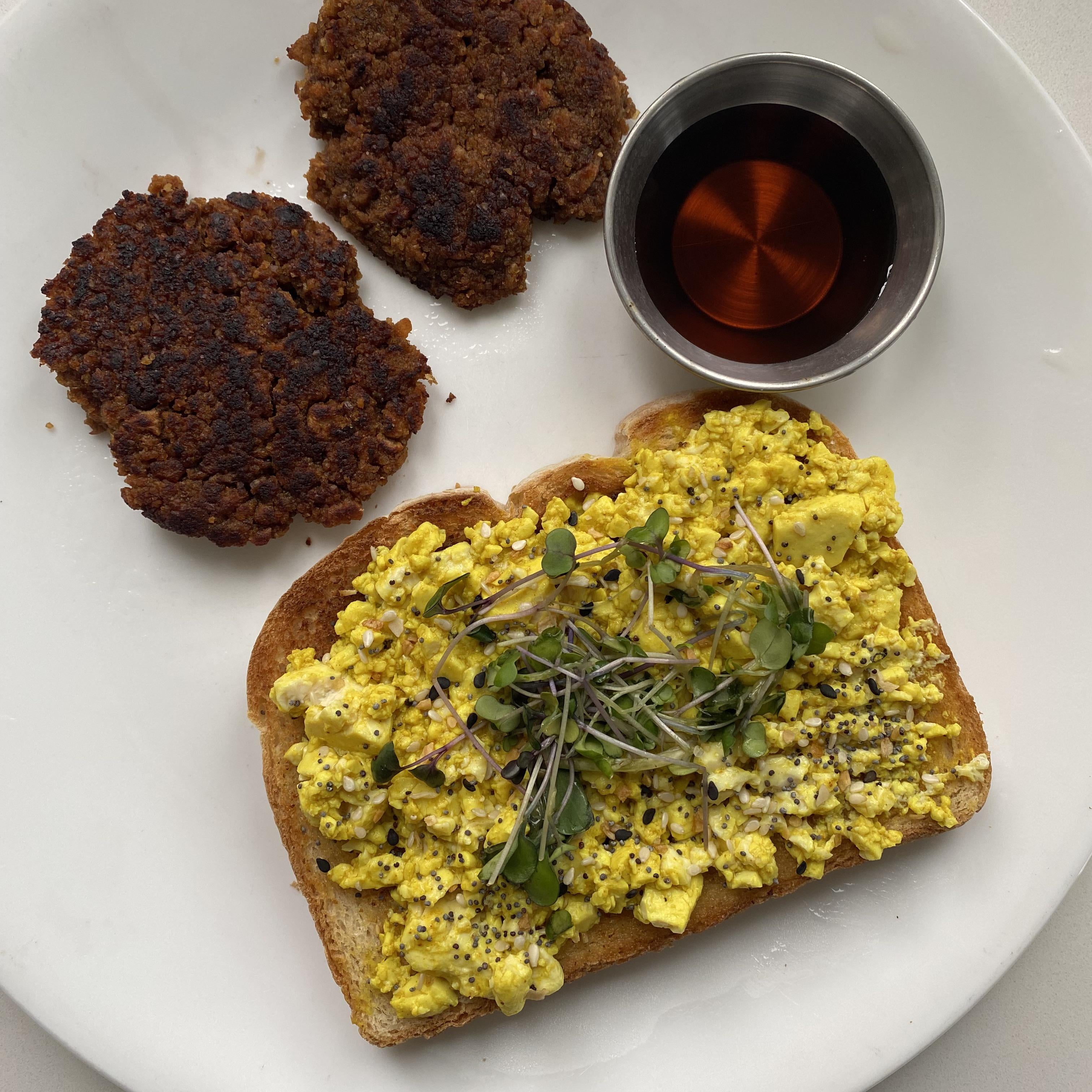 Silken tofu scramble over sourdough toast with everything bagel seasoning & spicy micro greens. TVP sausage patties with a side of maple syrup for dipping🫣