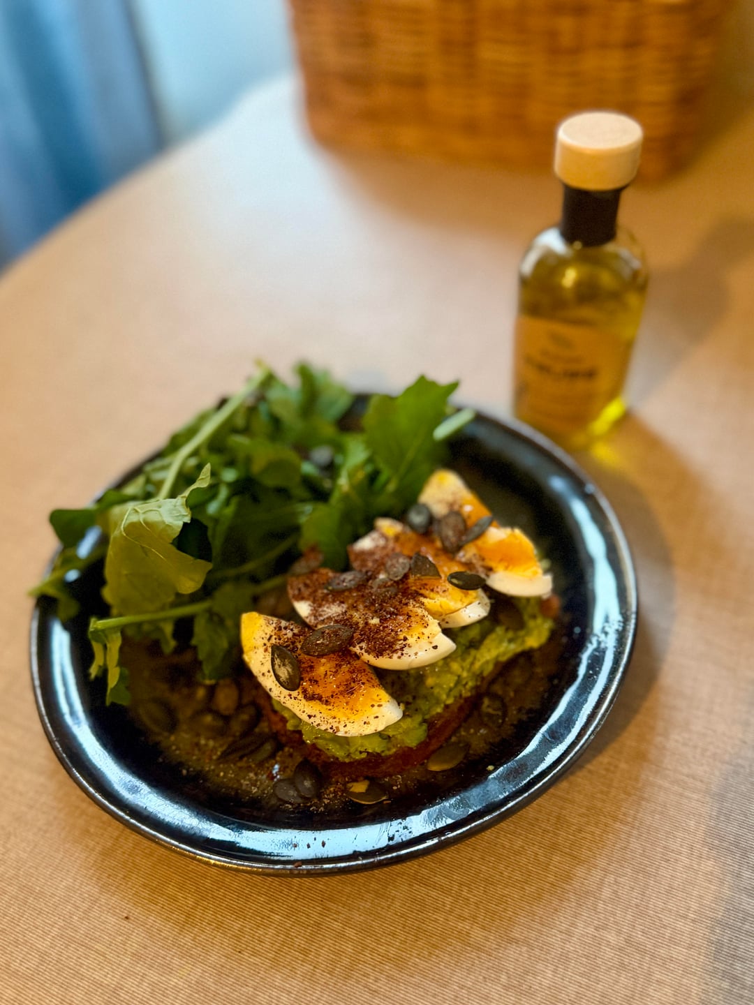 breakfast : dark bread with avocado, one egg, pumpkin seeds, a bit of truffle oil and mesclun