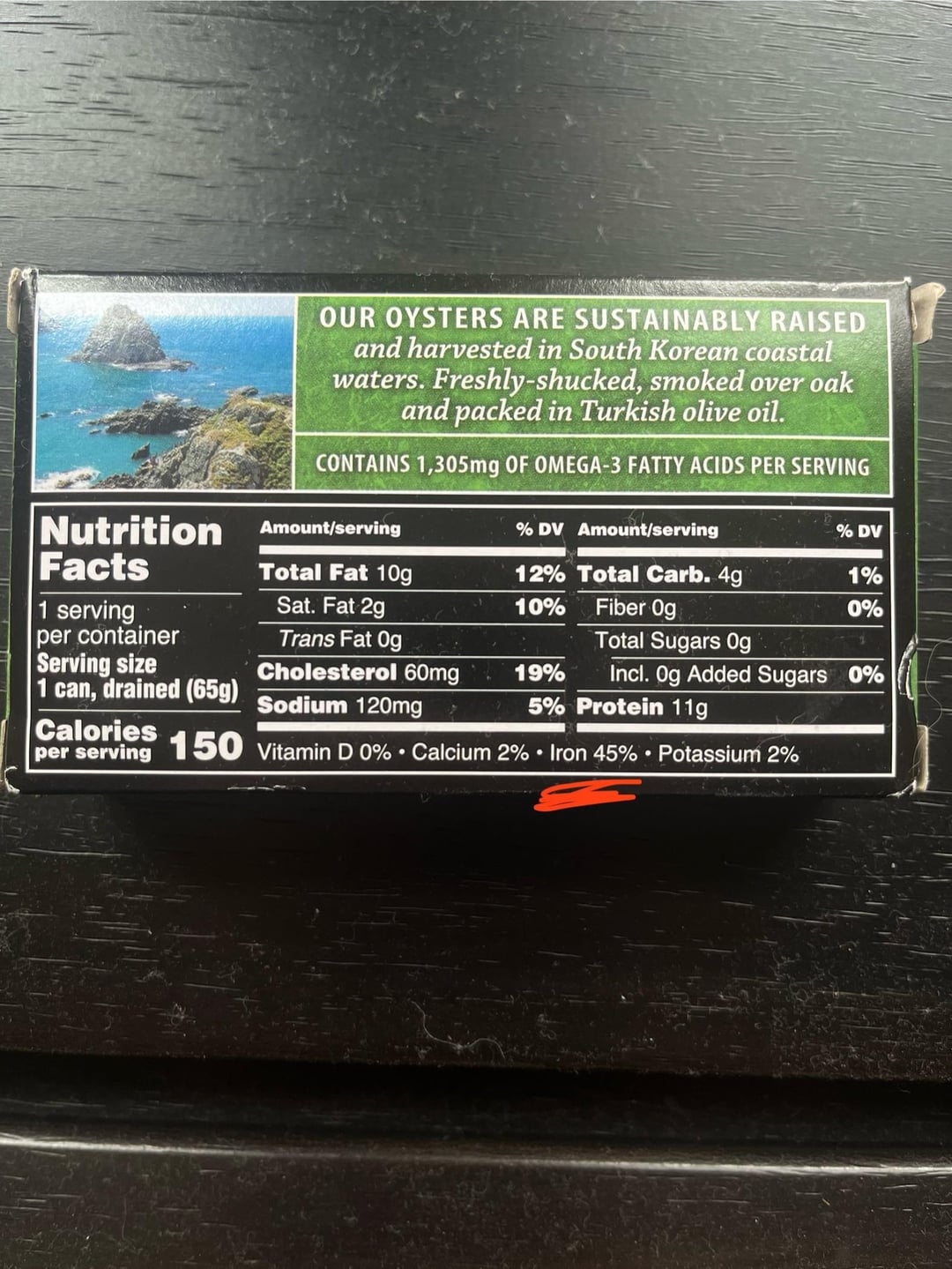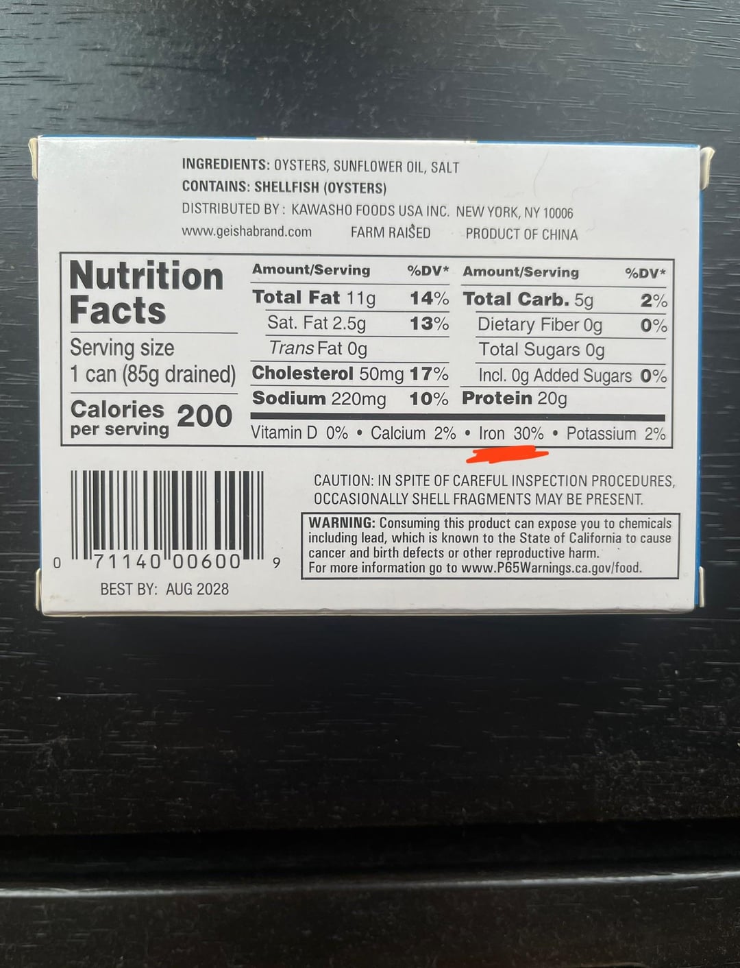 I had crown prince oysters last night and I feel so much better today. Their sardines also have much more iron than other brands – can anyone suggest why this might be? I also noticed they are high in calcium. Is it just that they’re heavily fortified?