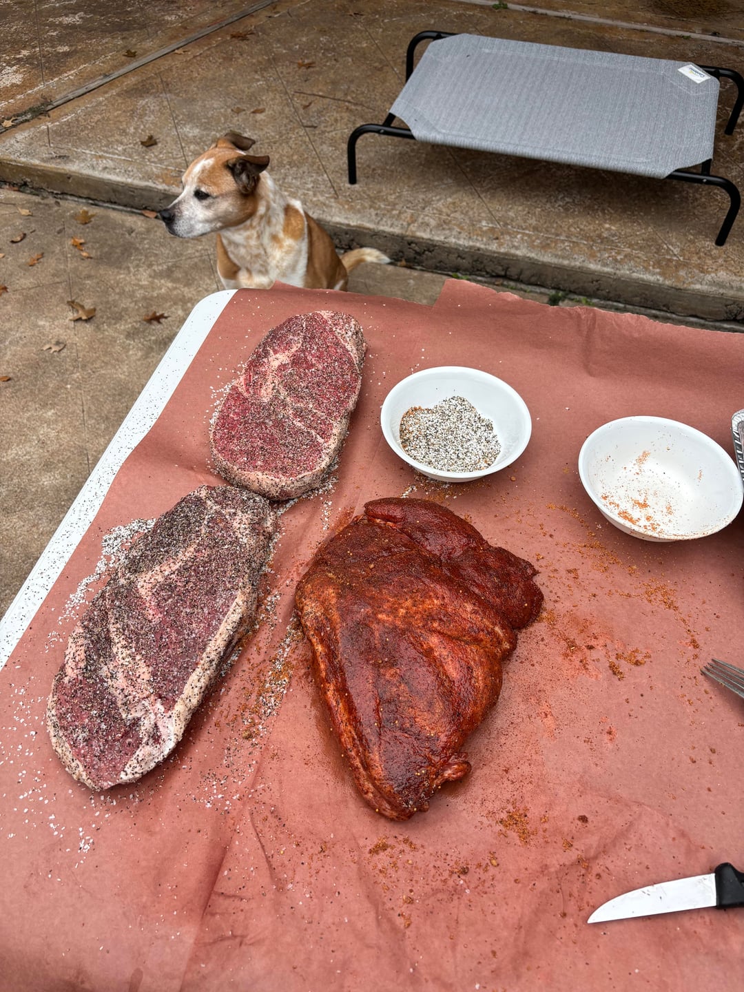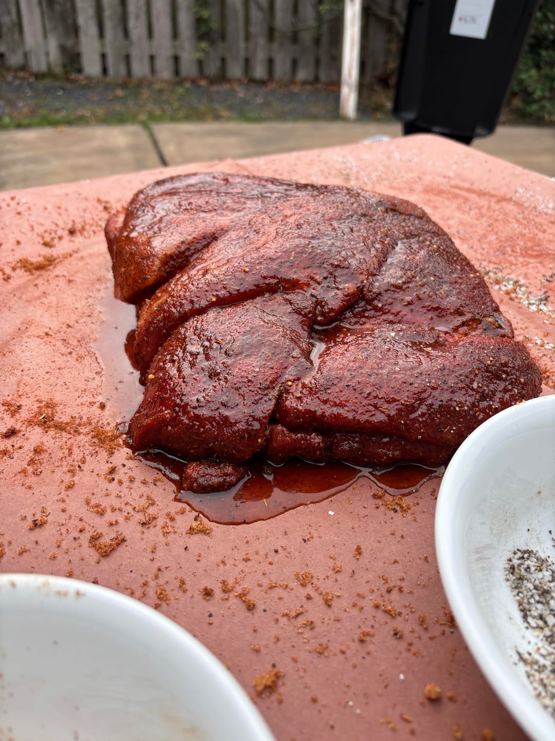 2:30 PM – Prepped, trimmed, seasoned all, put beef in fridge