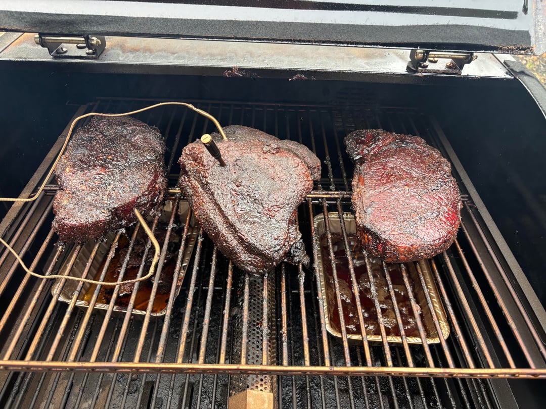 Did my first bigger cook (outside of chicken and pork chops) of 2x chuck roasts and pork shoulder. The result was amazing – the beef was maybe on the drier side, but awesome bark. A whole lot of what I would consider similar to burnt ends. The pulled pork was great. Below is my process and timing I did to have it done by lunch the next day: