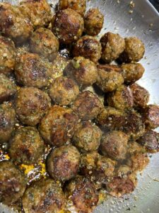 ■ Use a cookie scoop or your hands to roll golf ball sized meatballs and drop them into the skillet, keeping them slightly apart. Cook undisturbed until lightly browned on the bottom, about 5–6 minutes.