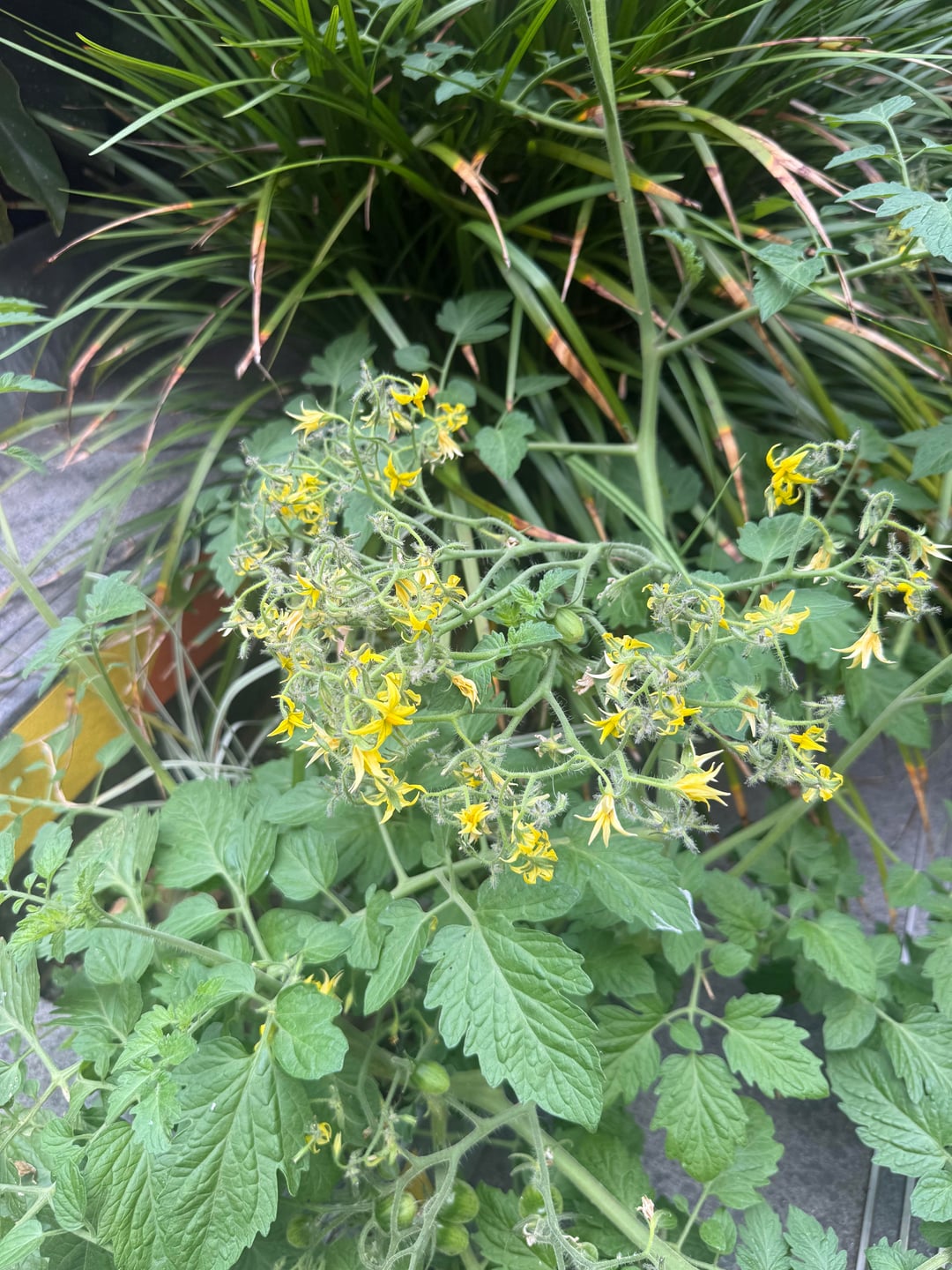 Found this volunteer seedling growing out of a garden in a public park. I imagine it’s some kind of cherry tomato but I’ve never seen so many flowers on one flowering branch. Are there named varieties that look like this?