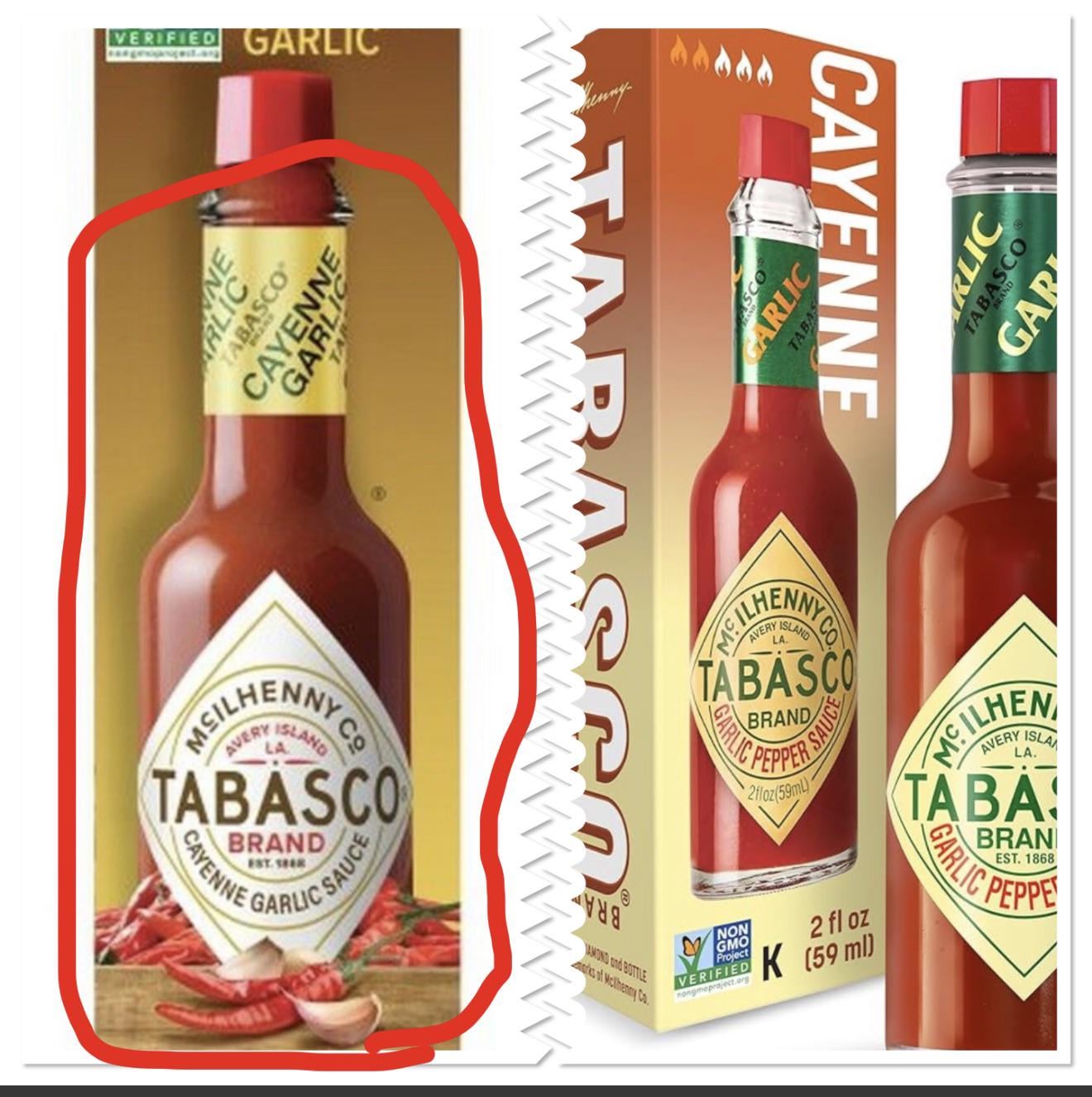 For quite a while now I've been looking around for a Tabasco flavor that I used to see a lot but can't find anymore. Tabasco used to call it "Cayenne Garlic Pepper Hot Sauce". They have one now that tricks you into thinking it's the old one because it has the word "Cayenne "printed real bag on the box but it's really just garlic Tabasco. I've circled in the image the one I'm looking for; the faker is on the right (new version?). I'm trying to find out if they discontinued it.