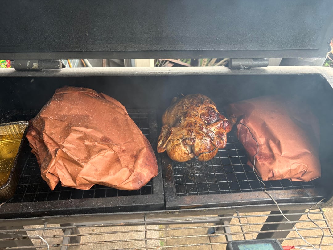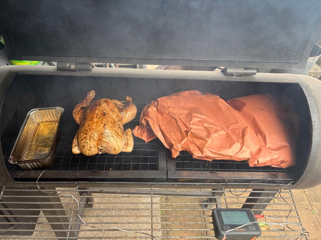 Nice I did this once but I spatchcocked it 225 heavy seasoning turned out fantastic no wrap needed. I really am liking the whole bird, bonus u get smokes meat for samis the next day 🙂