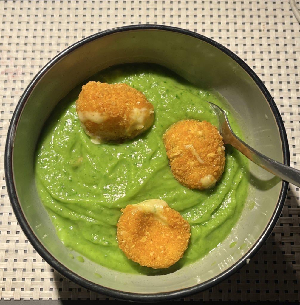 Mashed cauliflower with spinach, garlic and champions (and a bit of vegan cooking creme) and vegan chili cheese balls. (i ate one of the cheese balls straight out of the air fryer so it was 336 calories total for my meal)