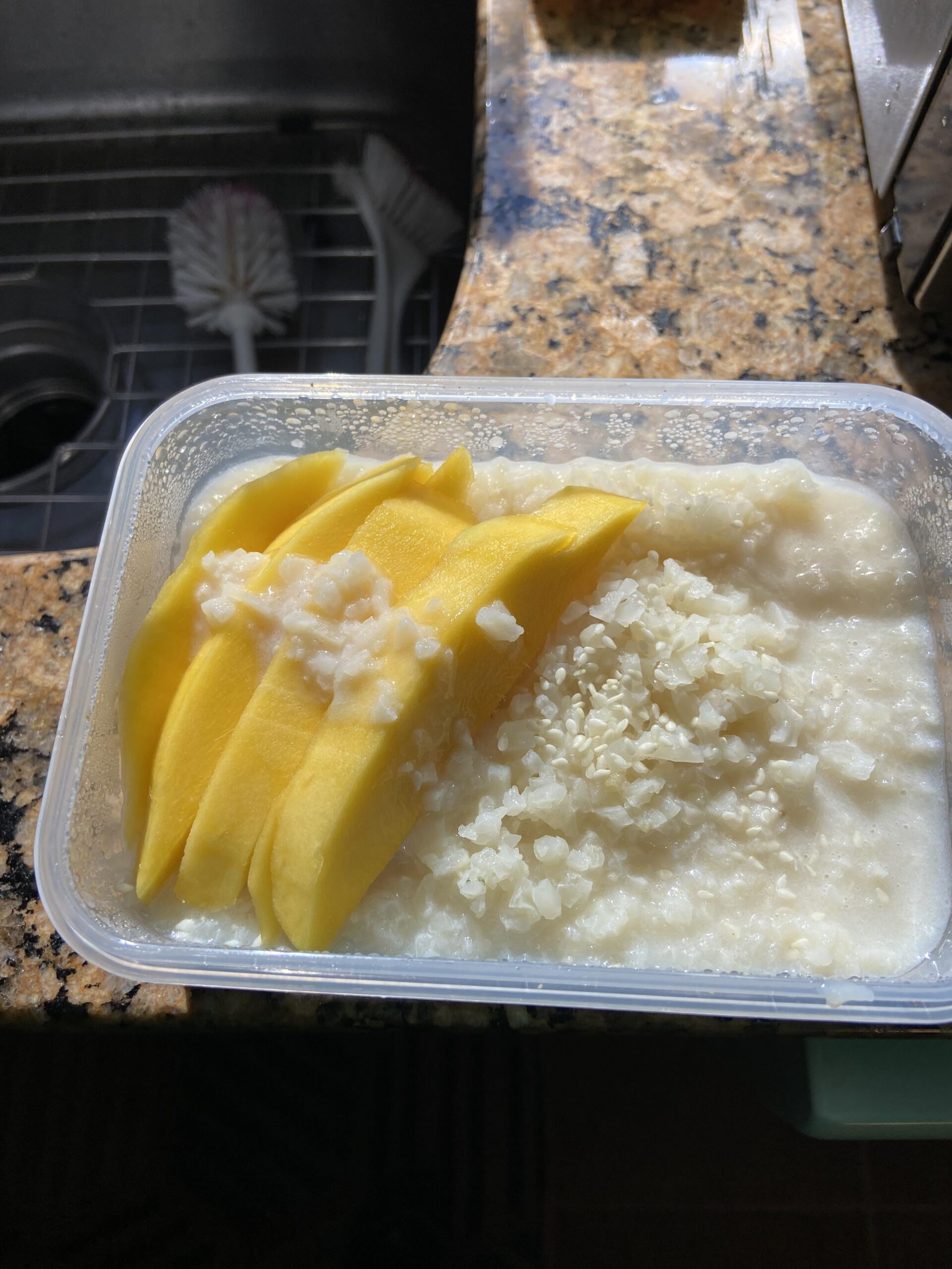 Cook and cool cauliflower rice. Mix CSE with maybe 3 oz water. Poor on top. Cool in fridge. Add fresh mango and sesame seeds.