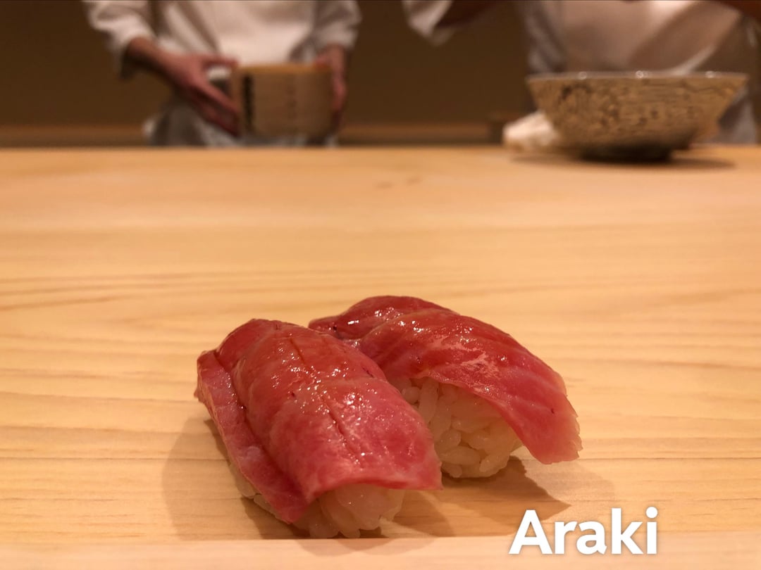 - Araki (Tabelog 4.22 / Google 5.0, but only one review). Memorable appetizers: red snapper from Hyogo; dried sea cucumber roe. Memorable nigiri: chutoro; otoro; noduguro; bigfin reef squid (aori ika); marinated tuna; shanghai snow crab; seared otoro with hand pulled matsutake mushrooms (unique piece and quite large); tuna roll with lots and lots of tuna (extra order). The tamago is also unique which included (I think) abalone, tiger prawn, and eggs. A regular booked for me. 60.000¥.
