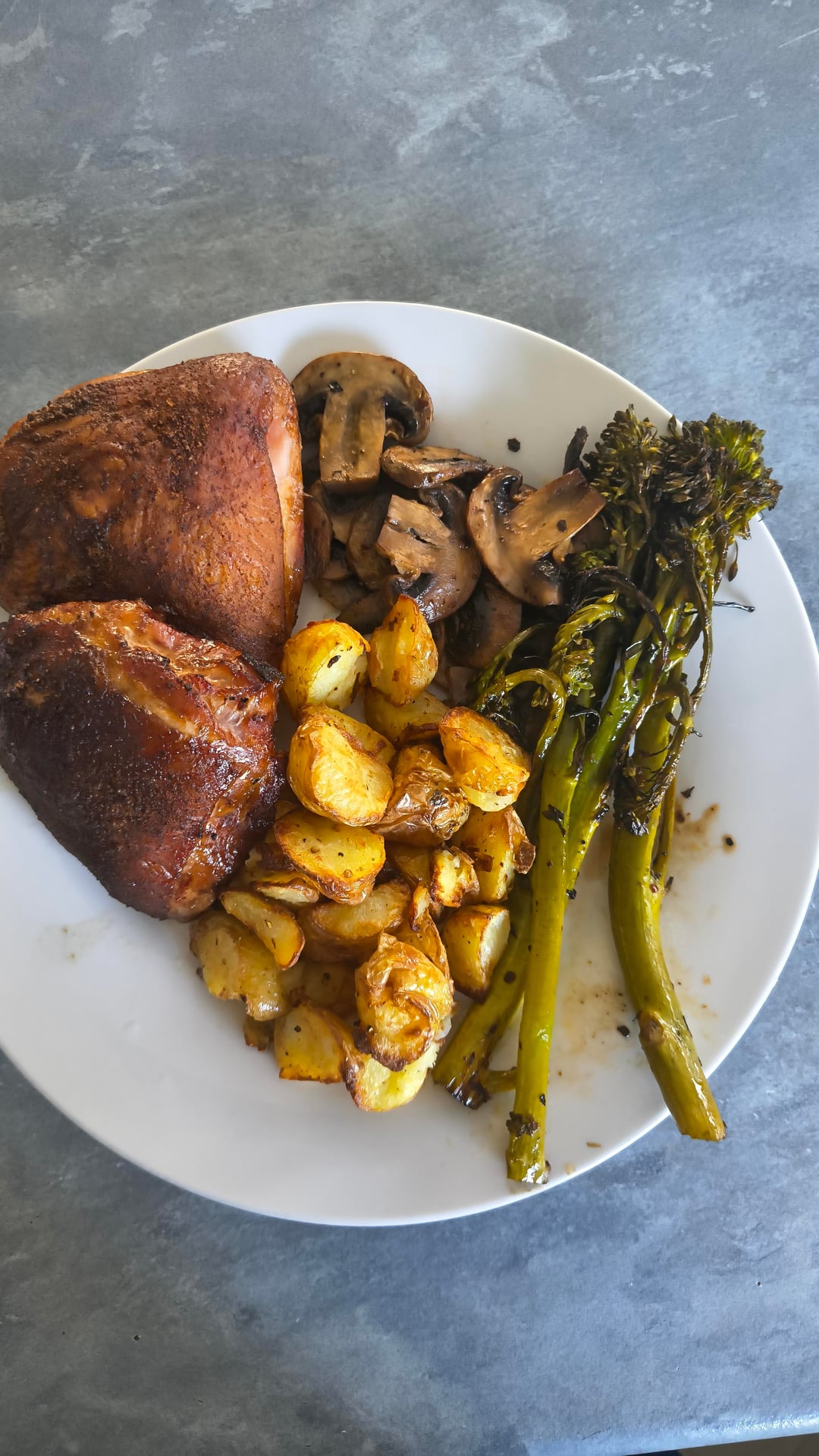 Cooling off in a child's paddling pool with a beer and dinner on the grill. Chicken thighs over Manuka with the Broccolini, Mushroom and Potato in a cast iron on the grill next to the chicken.