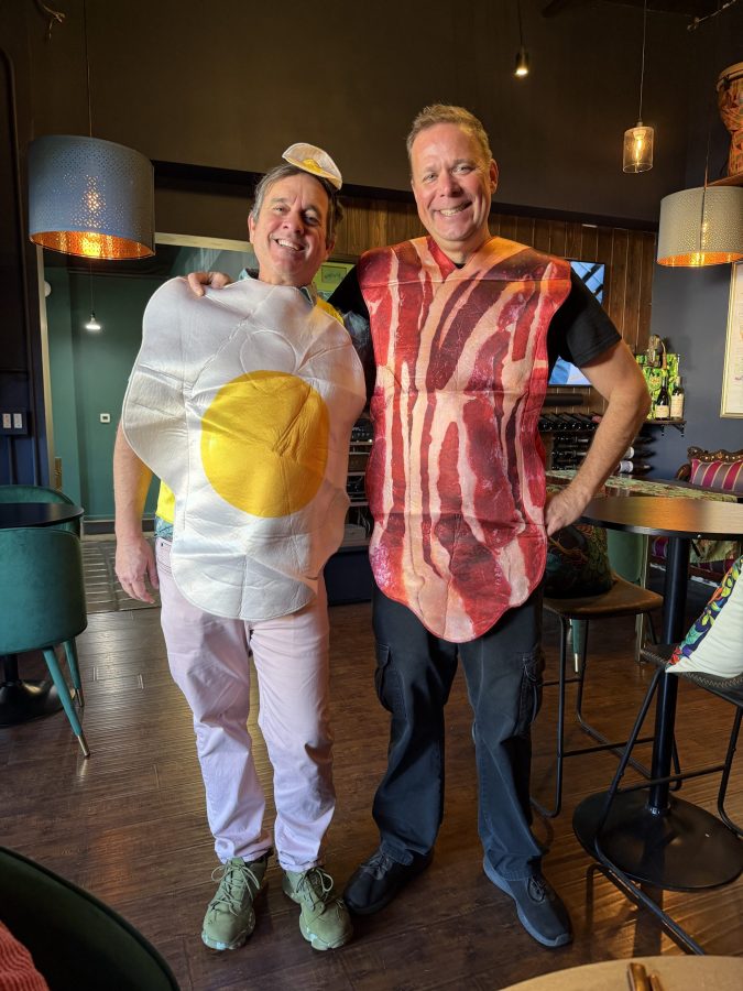 The PV Wine Club has been open for weekend brunch, and when I visited recently the owner and manager decided to dress for the occasion as bacon and a fried egg. Photo by Richard Foss