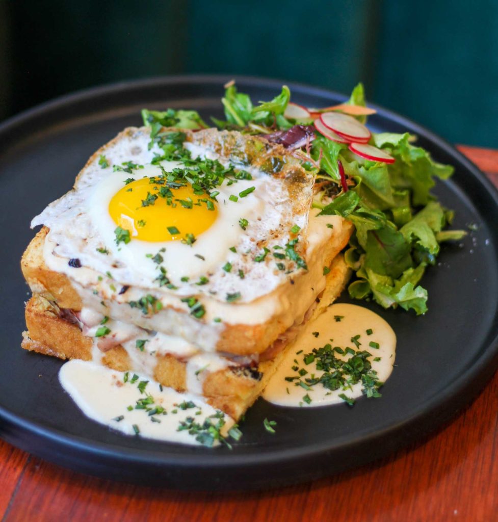 Croque Madame with brioche, Dijon, jambon de Bayonne, mornay and