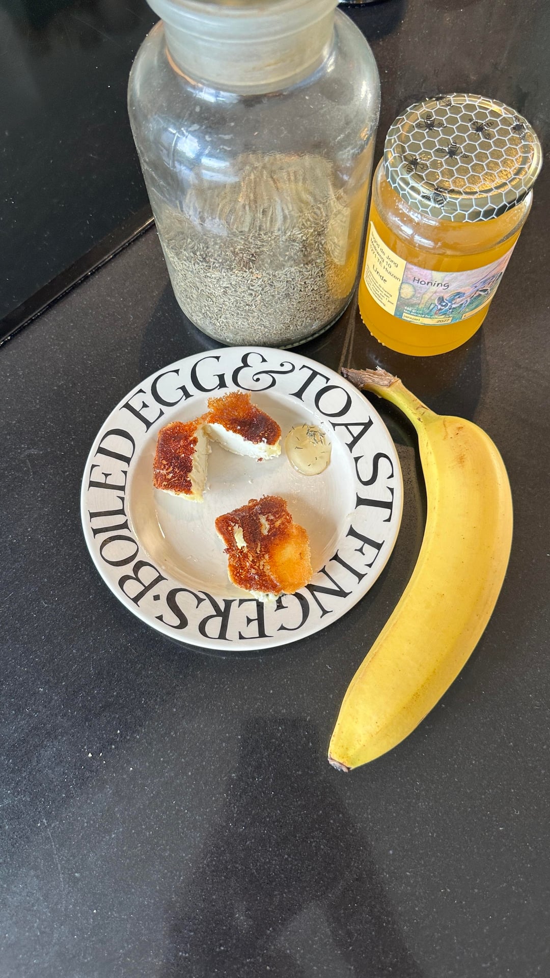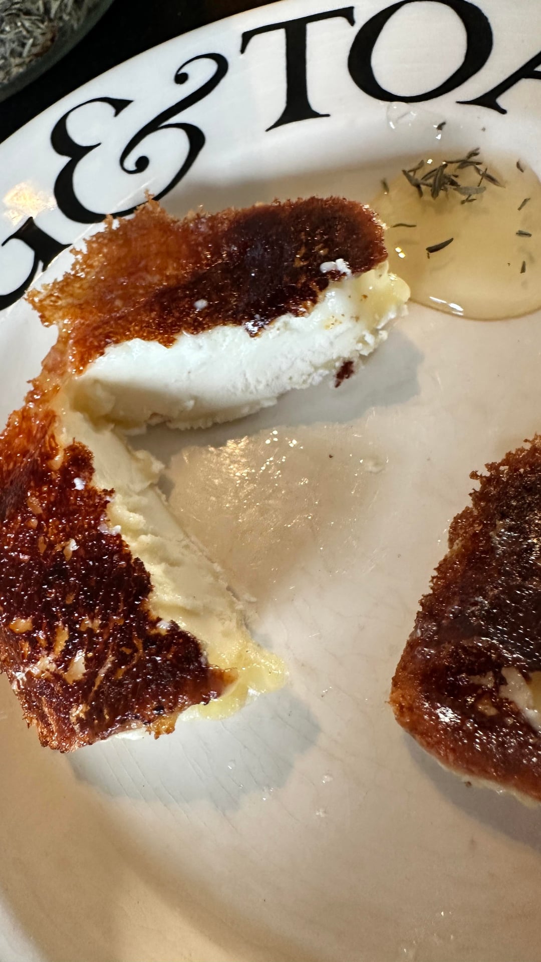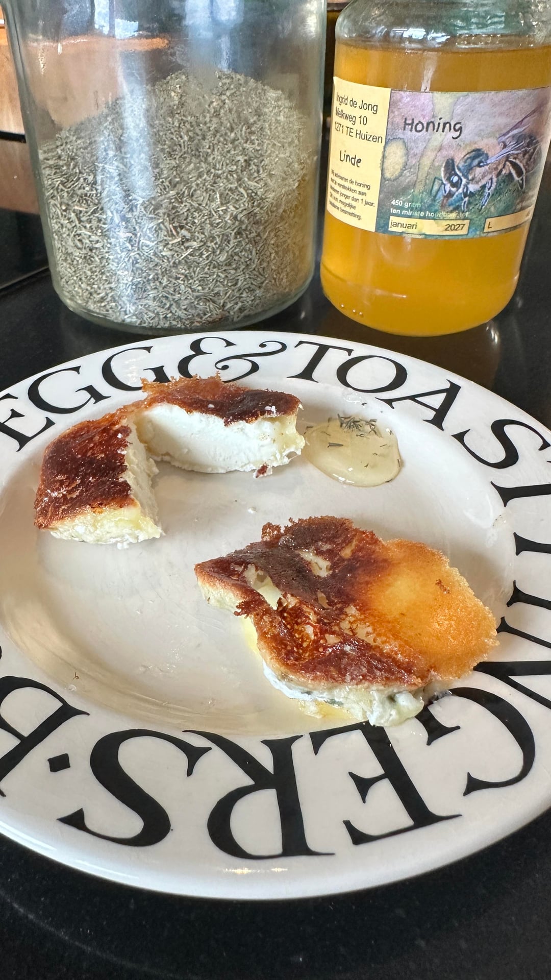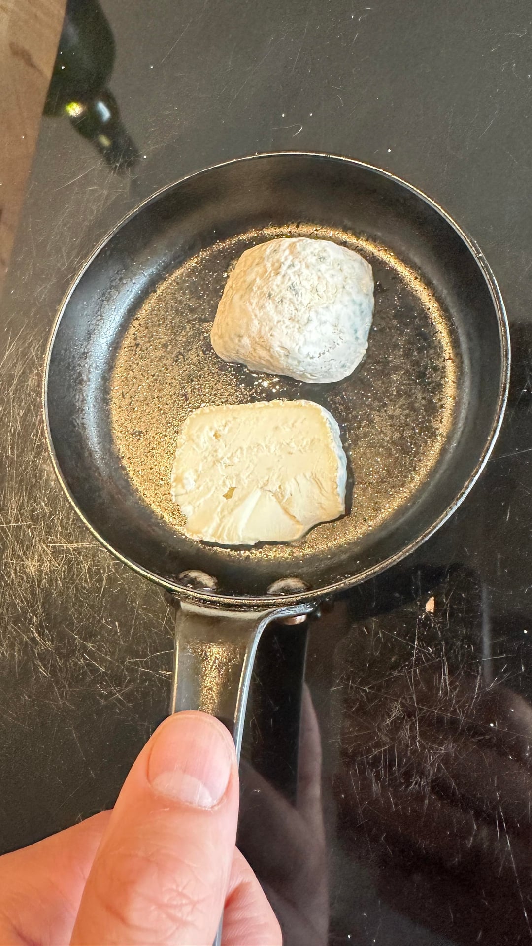 I cut my Chavignol, which was already half-eaten but hey, heated my pan (a tiny carbon steel one) to medium hot, added one single drop of olive oil per piece and laid the cheese on the cut sides until I saw the crust turn golden. Then straight onto a plate. Served with on the side a drop of linden honey and a light sprinkle of thyme (which I didn’t use, but my wife loved the combination).