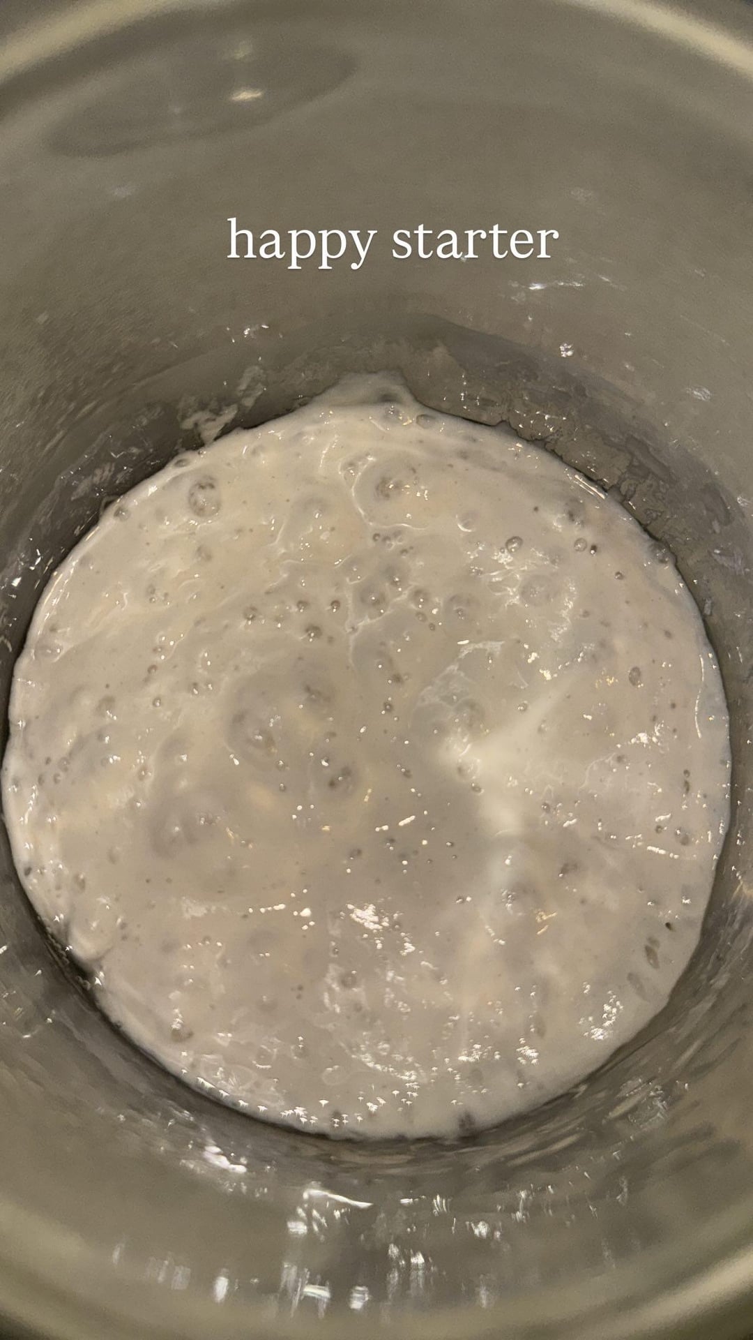 i added my starter to a bowl, water and olive oil and mixed until milky/yellow. then i added my bread flour and salt and mixed with a dough whisk. i mixed dough until no dry bits or flour pockets were left and dough was shaggy. i then, covered the bowl with damp towel and let rest for 30 min. After 30 min i begun my stretch and folds. i do 4 rounds every 30 min, for the first 3 i just did basic stretch and folds and for the the last round i did coil folds. after that i left my dough to rest overnight on the counter for about 9 hours, at this point it had almost trippled in size and was super bubbly/ jiggly.