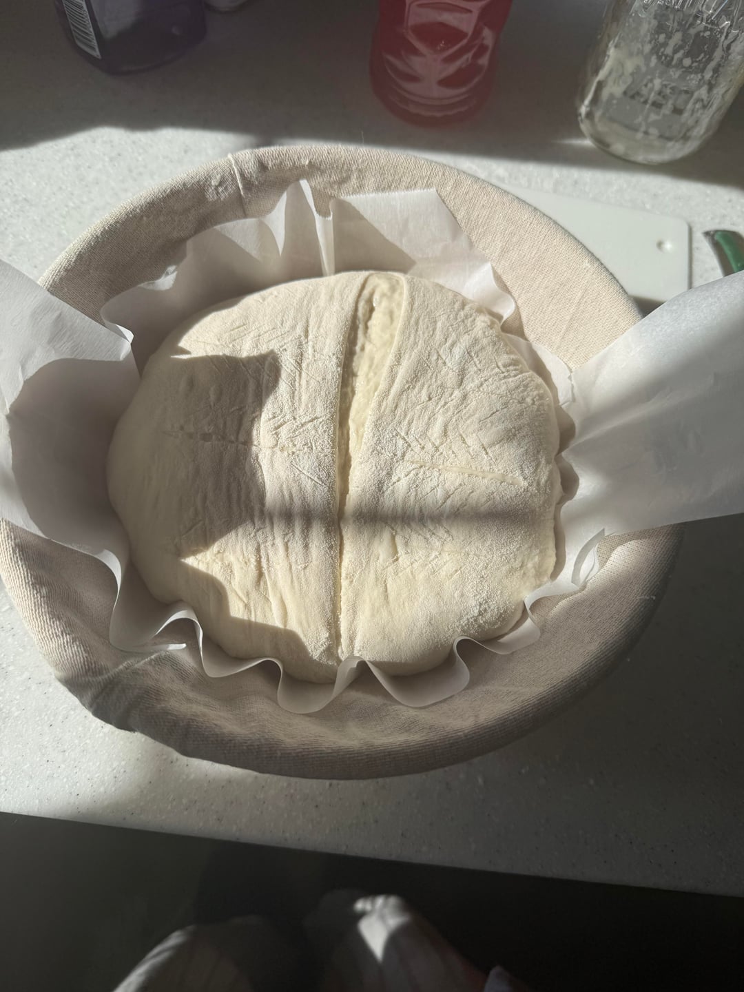 After that i flipped the bowl so the dough fell onto a clean counter and started to shape my dough, when the dough felt tight and shaped and put it in my floured banneton and covered it for about an hour at room temp. i check the dough and did the press test, it was ready.