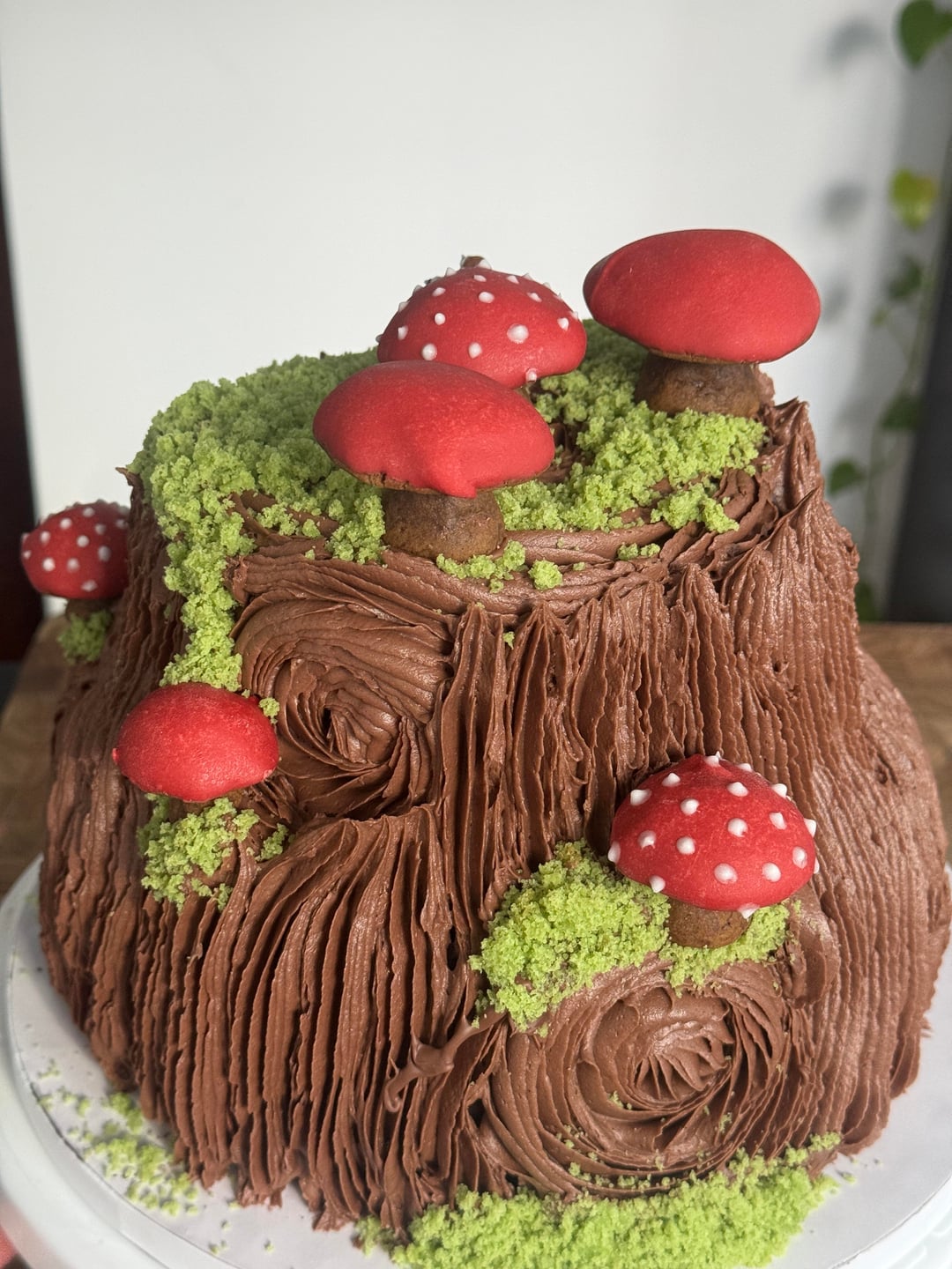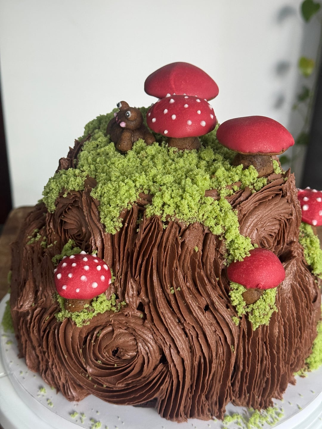 I made a chocolate cake with almond + hazelnut praline and chocolate ganache filling, pandan cake “moss” and gingerbread toad and mushrooms. Waiting for the boyfriend to come home so we can cut into it! 😋