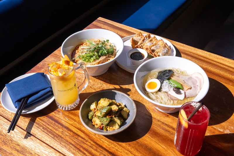 Spicy miso ramen (clockwise from top left), crispy gau gee, shio al tartufo ramen, berry soda, spicy garlicky cucumbers and a bento juice box cocktail at Toya Ramen & Bar. Sean Meagher | The Oregonian