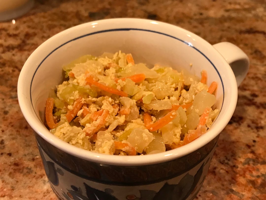 3) Egg Roll Bowl. I forget where I first got the recipe but it's basically onion, green onion, cabbage, shredded carrots with soy sauce and sesame oil – my preferred protein is eggs but you can sub anything.