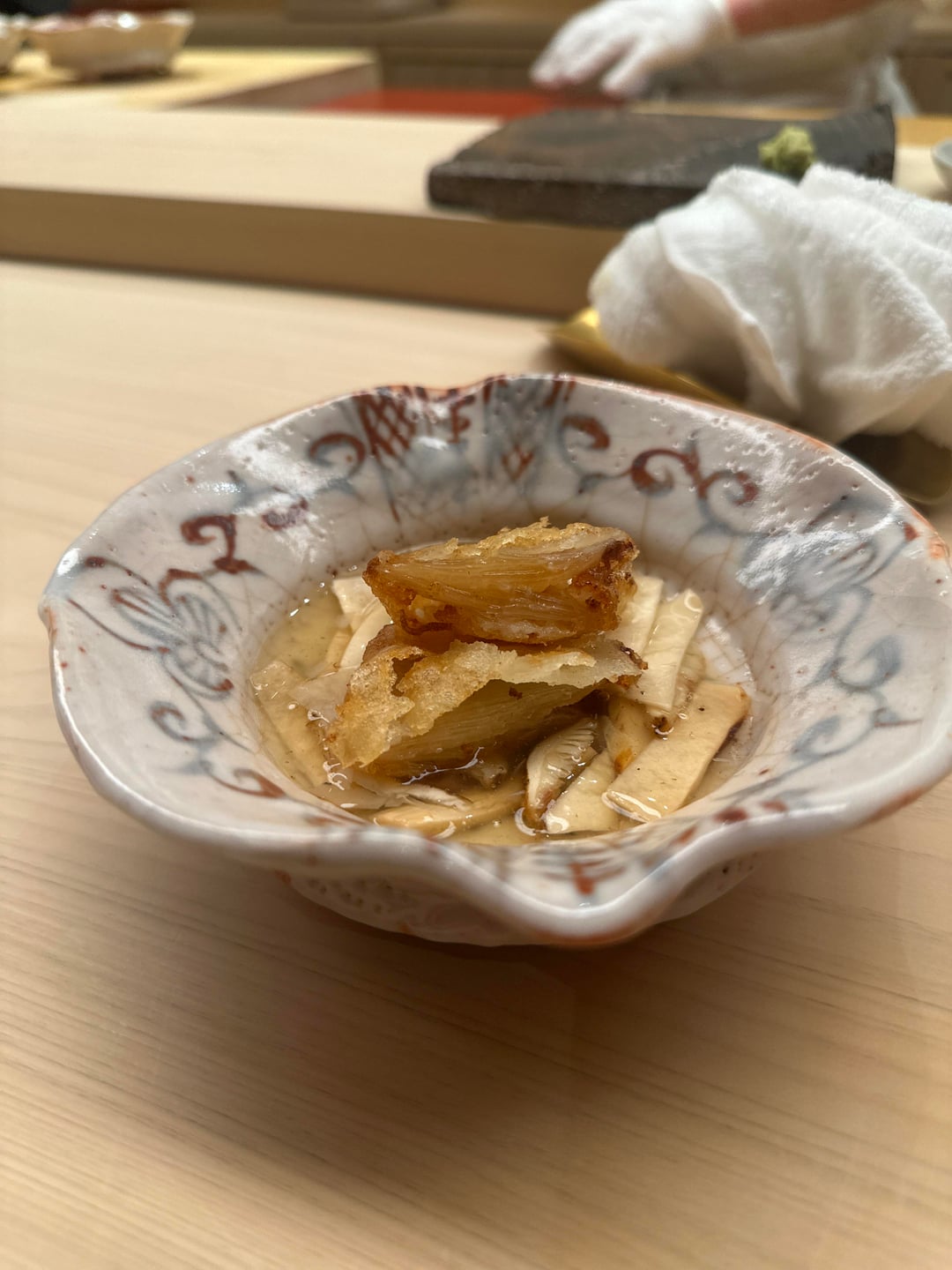 4. Ankimo w sweet shiitake & gotemba wasabi + chinmi place of ebi miso, kaki and kazunoko. A glass of kijoshu accompanies it like at Sugita but a different type, one of the nice gentleman at dinner mentioned he’d originally served it with the same hinotori but was mixing it up a bit today. This was so good, it was the best ankimo I’ve had on the trip