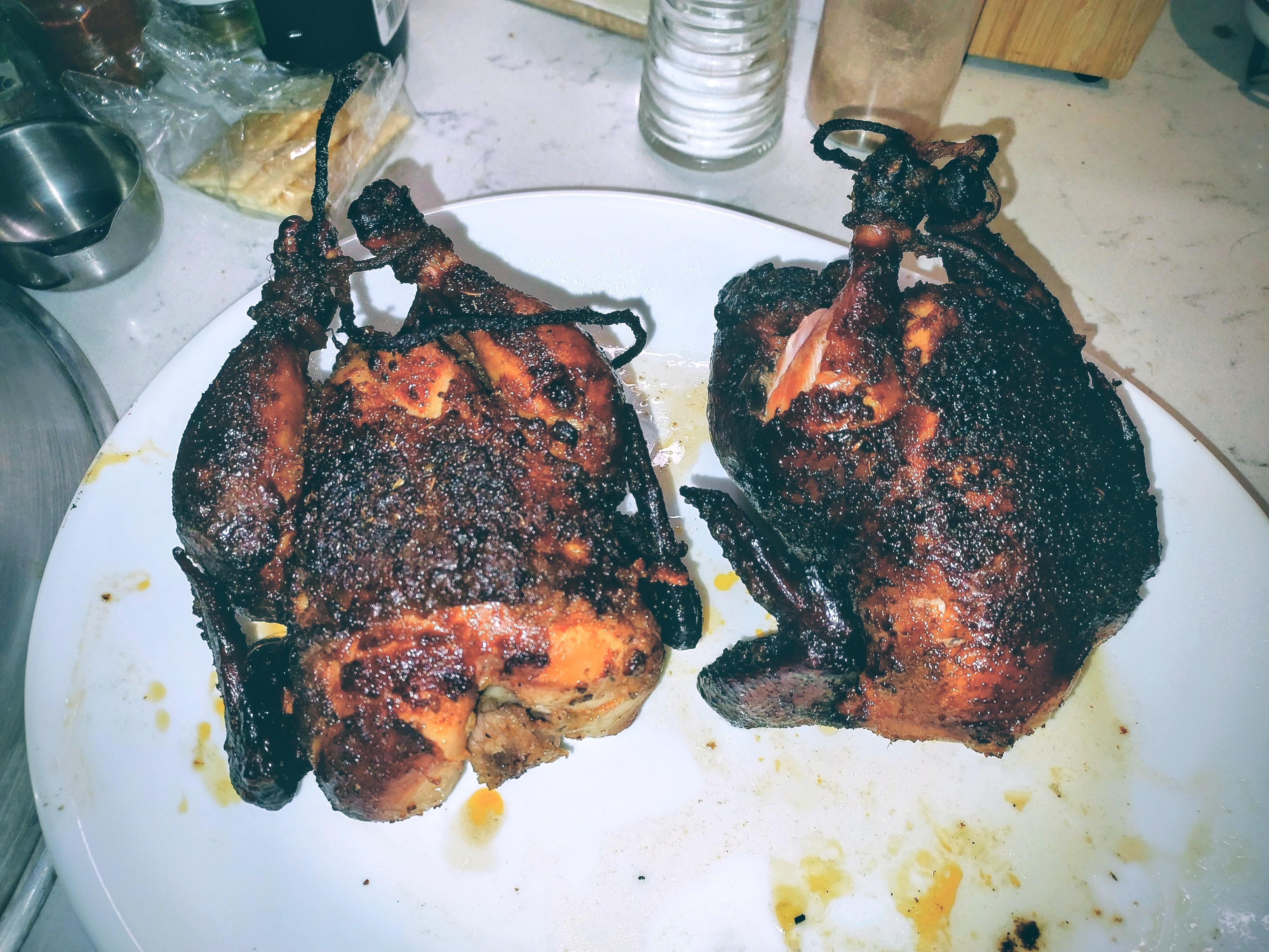 Looks great! Left side of righty is burned but breasts will be fine. Maybe thighs too. Who cares about the wing tips. What’s good looks real good. Go lower in temp but don’t shy away from the rub like you did